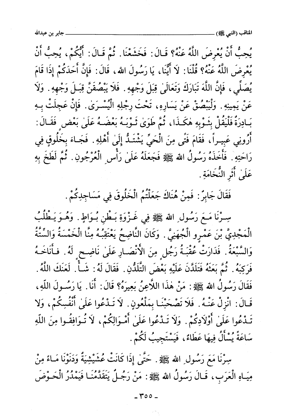 سِرْنَا مَعَ رَسُولِ اللهِ صلى الله عليه وسلم فِي غَزْوَةِ بَطْنِ بُوَاطٍ، وَهُوَ يَطْلُبُ الْمَجْدِيَّ بْنَ عَمْرٍو الْجُهَنِيَّ، وَكَانَ النَّاضِحُ يَعْقُبُهُ مِنَّا الْخَمْسَةُ وَالسِّتَّةُ وَالسَّبْعَةُ، فَدَارَتْ عُقْبَةُ رَجُلٍ مِنَ الأَنْصَارِ عَلَى نَاضِحٍ لَهُ، فَأَنَاخَهُ فَرَكِبَهُ، ثُمَّ بَعَثَهُ فَتَلَدَّنَ عَلَيْهِ بَعْضَ التَّلَدُّنِ، فَقَالَ لَهُ: شَأْ، لَعَنَكَ اللهُ، فَقَالَ رَسُولُ اللهِ صلى الله عليه وسلم: مَنْ هَذَا اللَاّعِنُ بَعِيرَهُ؟ قَالَ: أَنَا يَا رَسُولَ اللهِ، قَالَ: انْزِلْ عَنْهُ، فَلَا تَصْحَبْنَا بِمَلْعُونٍ، لَا تَدْعُوا عَلَى أَنْفُسِكُمْ، وَلَا تَدْعُوا عَلَى أَوْلَادِكُمْ، وَلَا تَدْعُوا عَلَى أَمْوَالِكُمْ، لَا تُوَافِقُوا مِنَ اللهِ سَاعَةً يُسْأَلُ فِيهَا عَطَاءٌ، فَيَسْتَجِيبُ لَكُمْ.