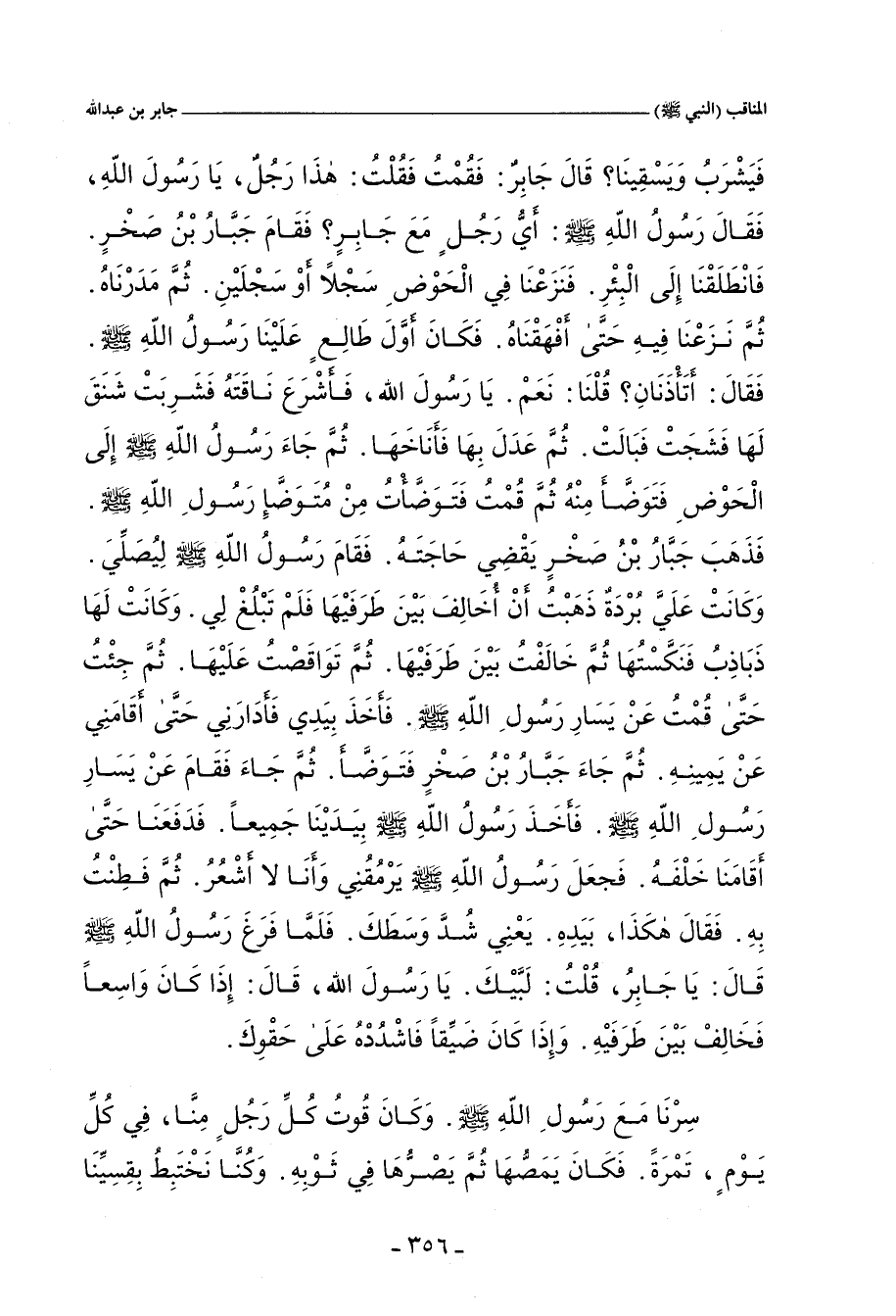 فَيَشْرَبُ وَيَسْقِينَا؟ قَالَ جَابِرٌ: فَقُمْتُ، فَقُلْتُ: هَذَا رَجُلٌ، يَا رَسُولَ اللهِ، فَقَالَ رَسُولُ اللهِ صلى الله عليه وسلم: أَيُّ رَجُلٍ مَعَ جَابِرٍ؟ فَقَامَ جَبَّارُ بْنُ صَخْرٍ، فَانْطَلَقْنَا إِلَى الْبِئْرِ، فَنَزَعْنَا فِي الْحَوْضِ سَجْلاً، أَوْ سَجْلَيْنِ، ثُمَّ مَدَرْنَاهُ، ثُمَّ نَزَعْنَا فِيهِ حَتَّى أَفْهَقْنَاهُ، فَكَانَ أَوَّلَ طَالِعٍ عَلَيْنَا رَسُولُ اللهِ صلى الله عليه وسلم، فَقَالَ: أَتَأْذَنَانِ؟ قُلْنَا: نَعَمْ، يَا رَسُولَ اللهِ، فَأَشْرَعَ نَاقَتَهُ، فَشَرِبَتْ شَنَقَ لَهَا فَشَجَتْ فَبَالَتْ، ثُمَّ عَدَلَ بِهَا فَأَنَاخَهَا، ثُمَّ جَاءَ رَسُولُ اللهِ صلى الله عليه وسلم إِلَى الْحَوْضِ، فَتَوَضَّأَ مِنْهُ، ثُمَّ قُمْتُ فَتَوَضَّأْتُ مِنْ مُتَوَضَّإِ رَسُولِ اللهِ صلى الله عليه وسلم، فَذَهَبَ جَبَّارُ بْنُ صَخْرٍ يَقْضِيَ حَاجَتَهُ، فَقَامَ رَسُولُ اللهِ صلى الله عليه وسلم لِيُصَلِّيَ، وَكَانَتْ عَلَيَّ بُرْدَةٌ، ذَهَبْتُ أَنْ أُخَالِفَ بَيْنَ طَرَفَيْهَا، فَلَمْ تَبْلُغْ لِي، وَكَانَتْ لَهَا ذَبَاذِبُ، فَنَكَّسْتُهَا، ثُمَّ خَالَفْتُ بَيْنَ طَرَفَيْهَا، ثُمَّ تَوَاقَصْتُ عَلَيْهَا، ثُمَّ جِئْتُ حَتَّى قُمْتُ عَنْ يَسَارِ رَسُولِ اللهِ صلى الله عليه وسلم، فَأَخَذَ بِيَدِي فَأَدَارَنِي، حَتَّى أَقَامَنِي عَنْ يَمِينِهِ، ثُمَّ جَاءَ جَبَّارُ بْنُ صَخْرٍ فَتَوَضَّأَ، ثُمَّ جَاءَ فَقَامَ عَنْ يَسَارِ رَسُولِ اللهِ صلى الله عليه وسلم، فَأَخَذَ رَسُولُ اللهِ صلى الله عليه وسلم بِيَدَيْنَا