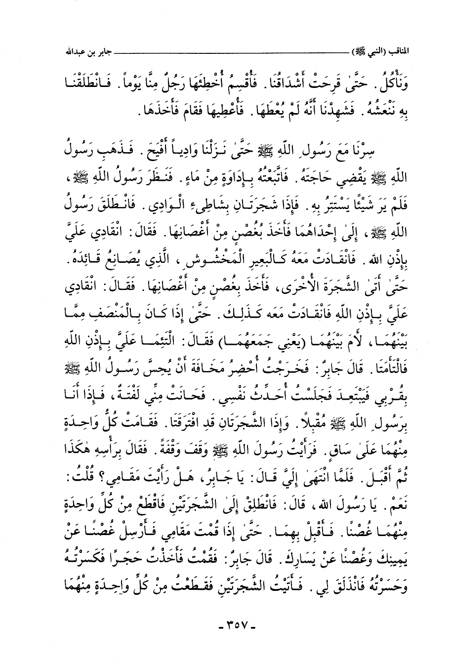 سِرْنَا مَعَ رَسُولِ اللهِ صلى الله عليه وسلم، حَتَّى نَزَلْنَا وَادِيًا أَفْيَحَ، فَذَهَبَ رَسُولُ اللهِ صلى الله عليه وسلم يَقْضِي حَاجَتَهُ، فَاتَّبَعْتُهُ بِإِدَاوَةٍ مِنْ مَاءٍ، فَنَظَرَ رَسُولُ اللهِ صلى الله عليه وسلم، فَلَمْ يَرَ شَيْئًا يَسْتَتِرُ بِهِ، فَإِذَا شَجَرَتَانِ بِشَاطِئِ الْوَادِي، فَانْطَلَقَ رَسُولُ اللهِ صلى الله عليه وسلم إِلَى إِحْدَاهُمَا، فَأَخَذَ بِغُصْنٍ مِنْ أَغْصَانِهَا، فَقَالَ: انْقَادِي عَلَيَّ بِإِذْنِ اللهِ، فَانْقَادَتْ مَعَهُ كَالْبَعِيرِ الْمَخْشُوشِ، الَّذِي يُصَانِعُ قَائِدَهُ، حَتَّى أَتَى الشَّجَرَةَ الأُخْرَى، فَأَخَذَ بِغُصْنٍ مِنْ أَغْصَانِهَا، فَقَالَ: انْقَادِي عَلَيَّ بِإِذْنِ اللهِ، فَانْقَادَتْ مَعَهُ كَذَلِكَ، حَتَّى إِذَا كَانَ بِالْمَنْصَفِ مِمَّا بَيْنَهُمَا، لأَمَ بَيْنَهُمَا - يَعْنِي جَمَعَهُمَا - فَقَالَ: الْتَئِمَا عَلَيَّ بِإِذْنِ اللهِ، فَالْتَأَمَتَا، قَالَ جَابِرٌ: فَخَرَجْتُ أُحْضِرُ مَخَافَةَ أَنْ يُحِسَّ رَسُولُ اللهِ صلى الله عليه وسلم بِقُرْبِي فَيَبْتَعِدَ - وَقَالَ مُحَمَّدُ بْنُ عَبَّادٍ: فَيَتَبَعَّدَ - فَجَلَسْتُ أُحَدِّثُ نَفْسِي، فَحَانَتْ مِنِّي لَفْتَةٌ، فَإِذَا أَنَا بِرَسُولِ اللهِ صلى الله عليه وسلم مُقْبِلاً، وَإِذَا الشَّجَرَتَانِ قَدِ افْتَرَقَتَا، فَقَامَتْ كُلُّ وَاحِدَةٍ مِنْهُمَا عَلَى سَاقٍ، فَرَأَيْتُ رَسُولَ اللهِ صلى الله عليه وسلم وَقَفَ وَقْفَةً، فَقَالَ بِرَأْسِهِ هَكَذَا - وَأَشَارَ أَبُو إِسْمَاعِيلَ بِرَأْسِهِ يَمِينًا وَشِمَالاً - ثُمَّ أَقْبَلَ، فَلَمَّا انْتَهَى إِلَيَّ، قَالَ: يَا جَابِرُ، هَلْ رَأَيْتَ مَقَامِي؟ قُلْتُ: نَعَمْ، يَا رَسُولَ اللهِ، قَالَ: فَانْطَلِقْ إِلَى الشَّجَرَتَيْنِ، فَاقْطَعْ مِنْ كُلِّ وَاحِدَةٍ مِنْهُمَا