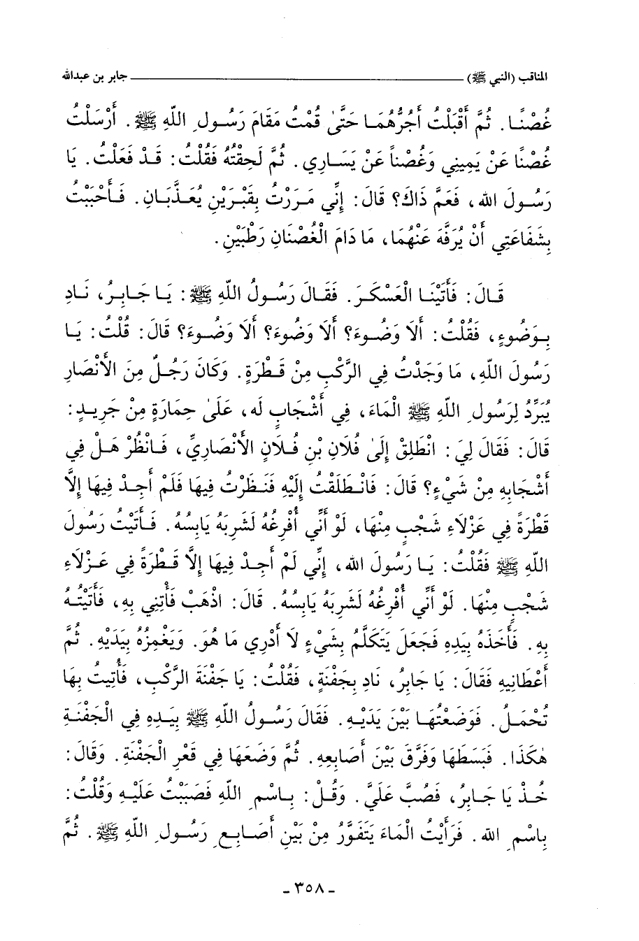قَالَ: فَأَتَيْنَا الْعَسْكَرَ، فَقَالَ رَسُولُ اللهِ صلى الله عليه وسلم: يَا جَابِرُ، نَادِ بِوَضُوءٍ، فَقُلْتُ: أَلَا وَضُوءَ؟ أَلَا وَضُوءَ؟ أَلَا وَضُوءَ؟ قَالَ: قُلْتُ: يَا رَسُولَ اللهِ، مَا وَجَدْتُ فِي الرَّكْبِ مِنْ قَطْرَةٍ، وَكَانَ رَجُلٌ مِنَ الأَنْصَارِ يُبَرِّدُ لِرَسُولِ اللهِ صلى الله عليه وسلم الْمَاءَ، فِي أَشْجَابٍ لَهُ، عَلَى حِمَارَةٍ مِنْ جَرِيدٍ، قَالَ: فَقَالَ لِيَ: انْطَلِقْ إِلَى فُلَانِ بْنِ فُلَانٍ الأَنْصَارِيِّ، فَانْظُرْ هَلْ فِي أَشْجَابِهِ مِنْ شَيْءٍ، قَالَ: فَانْطَلَقْتُ إِلَيْهِ، فَنَظَرْتُ فِيهَا، فَلَمْ أَجِدْ فِيهَا إِلَاّ قَطْرَةً فِي عَزْلَاءِ شَجْبٍ مِنْهَا، لَوْ أَنِّي أُفْرِغُهُ لَشَرِبَهُ يَابِسُهُ، فَأَتَيْتُ رَسُولَ اللهِ صلى الله عليه وسلم، فَقُلْتُ: يَا رَسُولَ اللهِ، إِنِّي لَمْ أَجِدْ فِيهَا إِلَاّ قَطْرَةً فِي عَزْلَاءِ شَجْبٍ مِنْهَا، لَوْ أَنِّي أُفْرِغُهُ لَشَرِبَهُ يَابِسُهُ، قَالَ: اذْهَبْ فَأْتِنِي بِهِ، فَأَتَيْتُهُ بِهِ، فَأَخَذَهُ بِيَدِهِ، فَجَعَلَ يَتَكَلَّمُ بِشَيْءٍ لَا أَدْرِي مَا هُوَ، وَيَغْمِزُهُ بِيَدَيْهِ، ثُمَّ أَعْطَانِيهِ، فَقَالَ: يَا جَابِرُ، نَادِ بِجَفْنَةٍ، فَقُلْتُ: يَا جَفْنَةَ الرَّكْبِ، فَأُتِيتُ بِهَا تُحْمَلُ، فَوَضَعْتُهَا بَيْنَ يَدَيْهِ، فَقَالَ رَسُولُ اللهِ صلى الله عليه وسلم بِيَدِهِ فِي الْجَفْنَةِ هَكَذَا، فَبَسَطَهَا، وَفَرَّقَ بَيْنَ أَصَابِعِهِ، ثُمَّ وَضَعَهَا فِي قَعْرِ الْجَفْنَةِ، وَقَالَ: خُذْ يَا جَابِرُ، فَصُبَّ عَلَيَّ، وَقُلْ: بِاسْمِ اللهِ، فَصَبَبْتُ عَلَيْهِ، وَقُلْتُ: بِاسْمِ اللهِ، فَرَأَيْتُ الْمَاءَ يَتَفَوَّرُ مِنْ بَيْنِ أَصَابِعِ رَسُولِ اللهِ صلى الله عليه وسلم، ثُمَّ