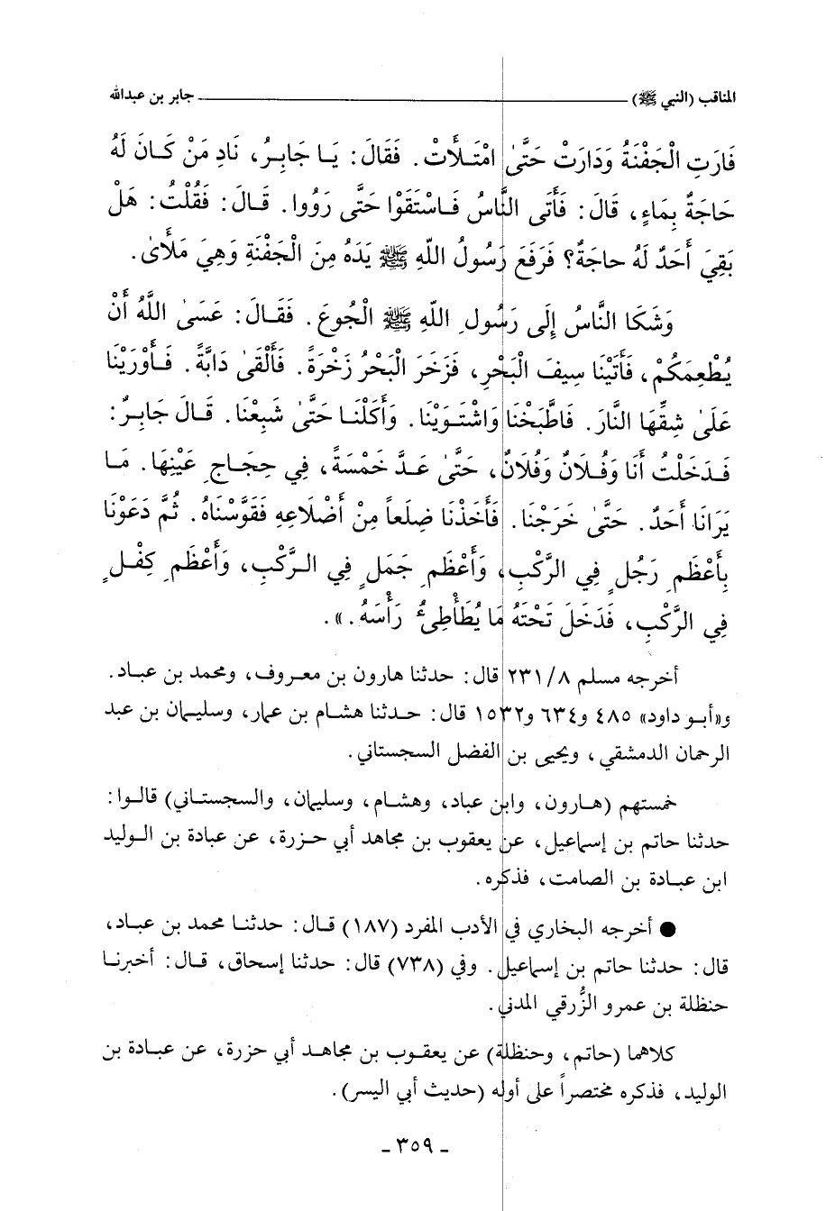 وَشَكَا النَّاسُ إِلَى رَسُولِ اللهِ صلى الله عليه وسلم الْجُوعَ، فَقَالَ: عَسَى اللهُ أَنْ يُطْعِمَكُمْ، فَأَتَيْنَا سِيفَ الْبَحْرِ، فَزَخَرَ الْبَحْرُ زَخْرَةً، فَأَلْقَى دَابَّةً، فَأَوْرَيْنَا عَلَى شِقِّهَا النَّارَ، فَاطَّبَخْنَا وَاشْتَوَيْنَا، وَأَكَلْنَا حَتَّى شَبِعْنَا، قَالَ جَابِرٌ: فَدَخَلْتُ أَنَا وَفُلَانٌ وَفُلَانٌ، حَتَّى عَدَّ خَمْسَةً فِي حِجَاجِ عَيْنِهَا، مَا يَرَانَا أَحَدٌ، حَتَّى خَرَجْنَا، فَأَخَذْنَا ضِلَعًا مِنْ أَضْلَاعِهِ، فَقَوَّسْنَاهُ، ثُمَّ دَعَوْنَا بِأَعْظَمِ رَجُلٍ فِي الرَّكْبِ، وَأَعْظَمِ جَمَلٍ فِي الرَّكْبِ، وَأَعْظَمِ كِفْلٍ فِي الرَّكْبِ، فَدَخَلَ تَحْتَهُ مَا يُطَأْطِئُ رَأْسَهُ.