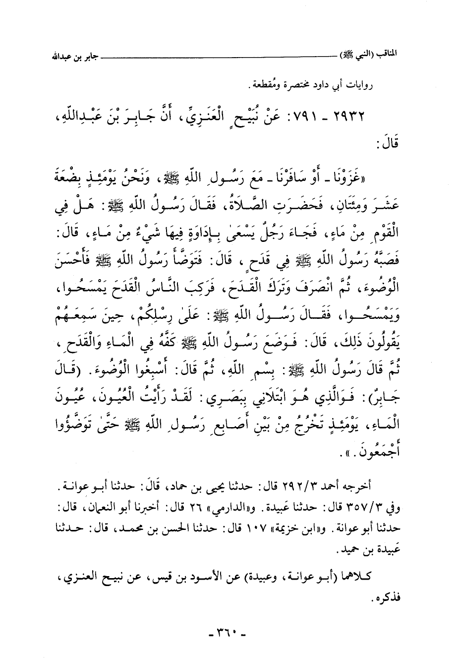 - وفي رواية: سَافَرْنَا مَعَ رَسُولِ اللهِ صلى الله عليه وسلم، قَالَ: فَحَضَرَتْ الصَّلاةُ، قَالَ: فَقَالَ رَسُولُ اللهِ صلى الله عليه وسلم: أَمَا فِي الْقَوْمِ مِنْ طَهُورٍ؟ قَالَ: فَجَاءَ رَجُلٌ بِفَضْلَةٍ فِي إِدَاوَةٍ، قَالَ: فَصَبَّهُ فِي قَدَحٍ، قَالَ: فَتَوَضَّأَ رَسُولُ اللهِ صلى الله عليه وسلم، ثُمَّ إِنَّ الْقَوْمَ أَتَوْا بَقِيَّةَ الطَّهُورِ، فَقَالُوا: تَمَسَّحُوا تَمَسَّحُوا، قَالَ: فَسَمِعَهُمْ رَسُولُ اللهِ صلى الله عليه وسلم، فَقَالَ: عَلَى رِسْلِكُمْ، قَالَ: فَضَرَبَ رَسُولُ اللهِ صلى الله عليه وسلم يَدَهُ فِي الْقَدَحِ، فِي جَوْفِ الْمَاءِ، قَالَ: ثُمَّ قَالَ: أَسْبِغُوا الْوُضُوءَ - الطَّهُورَ - قَالَ: فَقَالَ جَابِرُ بْنُ عَبْدِ اللهِ: وَالَّذِي أَذْهَبَ بَصَرِي، قَالَ: وَكَانَ قَدْ ذَهَبَ بَصَرُهُ، لَقَدْ رَأَيْتُ الْمَاءَ يَخْرُجُ مِنْ بَيْنِ أَصَابِعِ رَسُولِ اللهِ صلى الله عليه وسلم، فَلَمْ يَرْفَعْ يَدَهُ حَتَّى تَوَضَّؤُوا أَجْمَعُونَ.