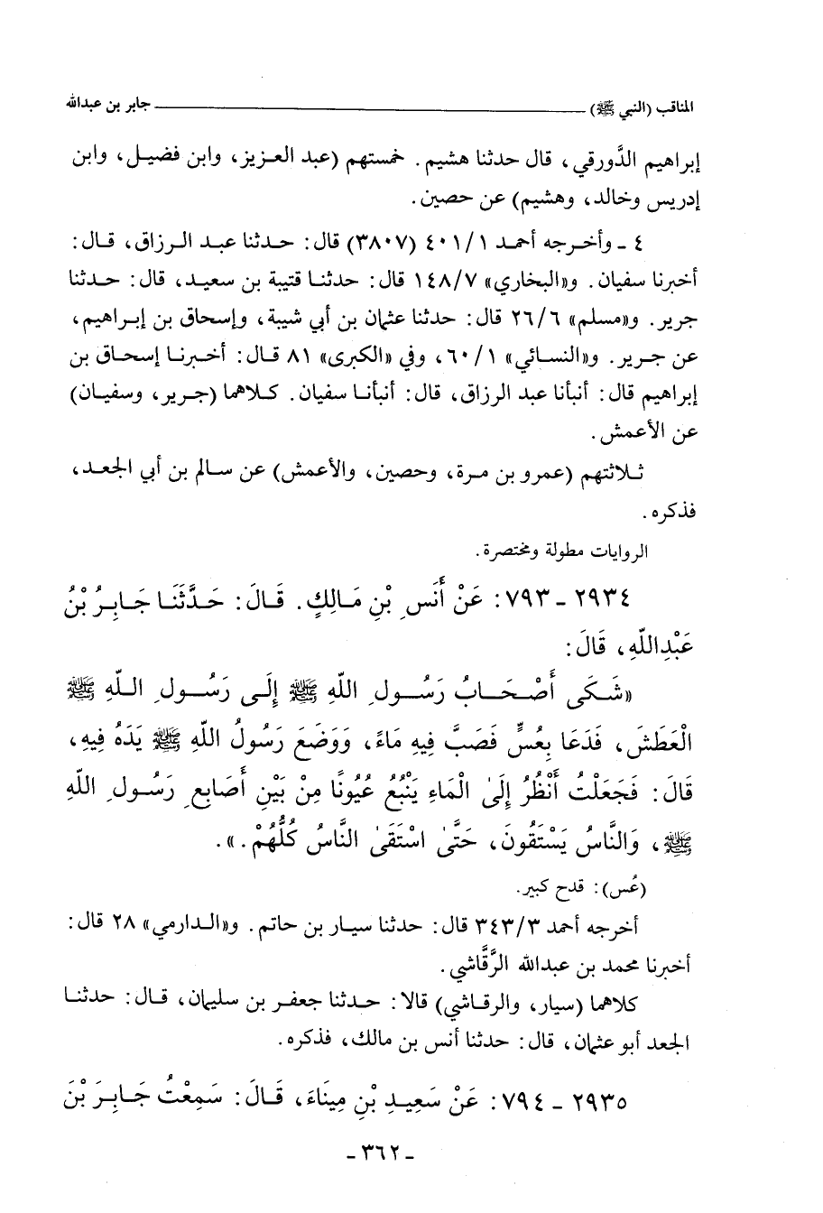 - لفظ سَيَّار بن حاتم: شَكَا أَصْحَابُ رَسُولِ اللهِ صلى الله عليه وسلم إِلَيْهِ الْعَطَشَ، قَالَ: فَدَعَا بِعُسٍّ، فَصُبَّ فِيهِ شَيْءٌ مِنَ الْمَاءٍ، فَوَضَعَ رَسُولُ اللهِ صلى الله عليه وسلم فِيهِ يَدَهُ، وَقَالَ: اسْقُوا، فَاسْتَقَى النَّاسُ، قَالَ: فَكُنْتُ أَرَى الْعُيُونَ تَنْبُعُ مِنْ بَيْنِ أَصَابِعِ رَسُولِ اللهِ صلى الله عليه وسلم.