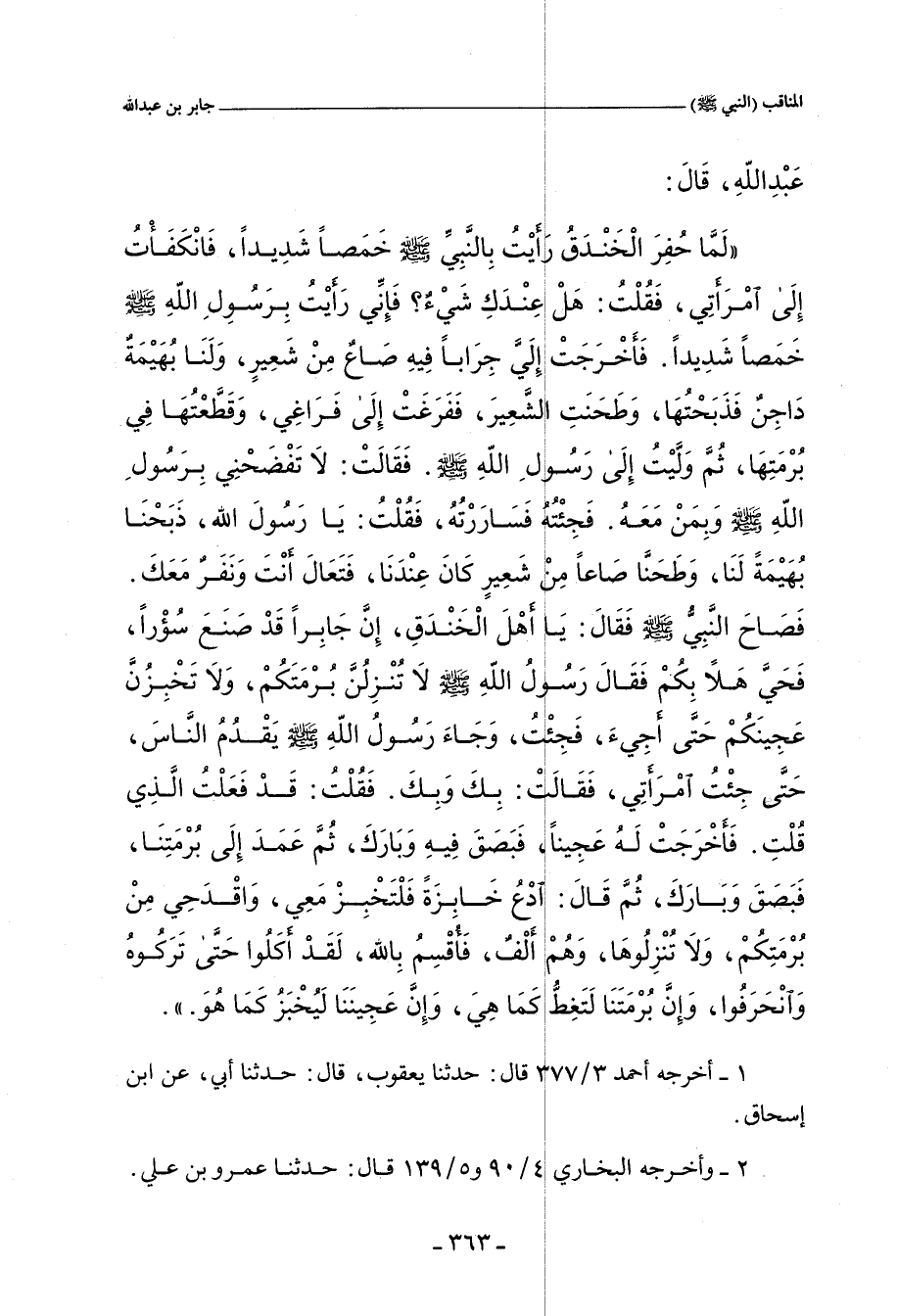 لَمَّا حُفِرَ الْخَنْدَقُ، رَأَيْتُ بِالنَّبِيِّ صلى الله عليه وسلم خَمَصًا شَدِيدًا، فَانْكَفَأْتُ إِلَى امْرَأَتِي، فَقُلْتُ: هَلْ عِنْدَكِ شَيْءٌ؟ فَإِنِّي رَأَيْتُ بِرَسُولِ اللهِ صلى الله عليه وسلم خَمَصًا شَدِيدًا، فَأَخْرَجَتْ إِلَيَّ جِرَابًا فِيهِ صَاعٌ مِنْ شَعِيرٍ، وَلَنَا بُهَيْمَةٌ دَاجِنٌ، فَذَبَحْتُهَا، وَطَحَنَتِ الشَّعِيرَ، فَفَرَغَتْ إِلَى فَرَاغِي، وَقَطَّعْتُهَا فِي بُرْمَتِهَا، ثُمَّ وَلَّيْتُ إِلَى رَسُولِ اللهِ صلى الله عليه وسلم، فَقَالَتْ: لَا تَفْضَحْنِي بِرَسُولِ اللهِ صلى الله عليه وسلم وَبِمَنْ مَعَهُ، فَجِئْتُهُ فَسَارَرْتُهُ، فَقُلْتُ: يَا رَسُولَ اللهِ، ذَبَحْنَا بُهَيْمَةً لَنَا، وَطَحَنَّا صَاعًا مِنْ شَعِيرٍ كَانَ عِنْدَنَا، فَتَعَالَ أَنْتَ وَنَفَرٌ مَعَكَ، فَصَاحَ النَّبِيُّ صلى الله عليه وسلم، فَقَالَ: يَا أَهْلَ الْخَنْدَقِ، إِنَّ جَابِرًا قَدْ صَنَعَ سُؤْرًا، فَحَيَّ هَلاً بِكُمْ، فَقَالَ رَسُولُ اللهِ صلى الله عليه وسلم: لَا تُنْزِلُنَّ بُرْمَتَكُمْ، وَلَا تَخْبِزُنَّ عَجِينَكُمْ، حَتَّى أَجِيءَ، فَجِئْتُ، وَجَاءَ رَسُولُ اللهِ صلى الله عليه وسلم يَقْدُمُ النَّاسَ، حَتَّى جِئْتُ امْرَأَتِي، فَقَالَتْ: بِكَ وَبِكَ، فَقُلْتُ: قَدْ فَعَلْتُ الَّذِي قُلْتِ، فَأَخْرَجَتْ لَهُ عَجِينًا، فَبَصَقَ فِيهِ وَبَارَكَ، ثُمَّ عَمَدَ إِلَى بُرْمَتِنَا فَبَصَقَ وَبَارَكَ، ثُمَّ قَالَ: ادْعُ خَابِزَةً فَلْتَخْبِزْ مَعِي، وَاقْدَحِي مِنْ بُرْمَتِكُمْ، وَلَا تُنْزِلُوهَا، وَهُمْ أَلْفٌ، فَأُقْسِمُ بِاللهِ، لَقَدْ أَكَلُوا، حَتَّى تَرَكُوهُ وَانْحَرَفُوا، وَإِنَّ بُرْمَتَنَا لَتَغِطُّ كَمَا هِيَ، وَإِنَّ عَجِينَنَا