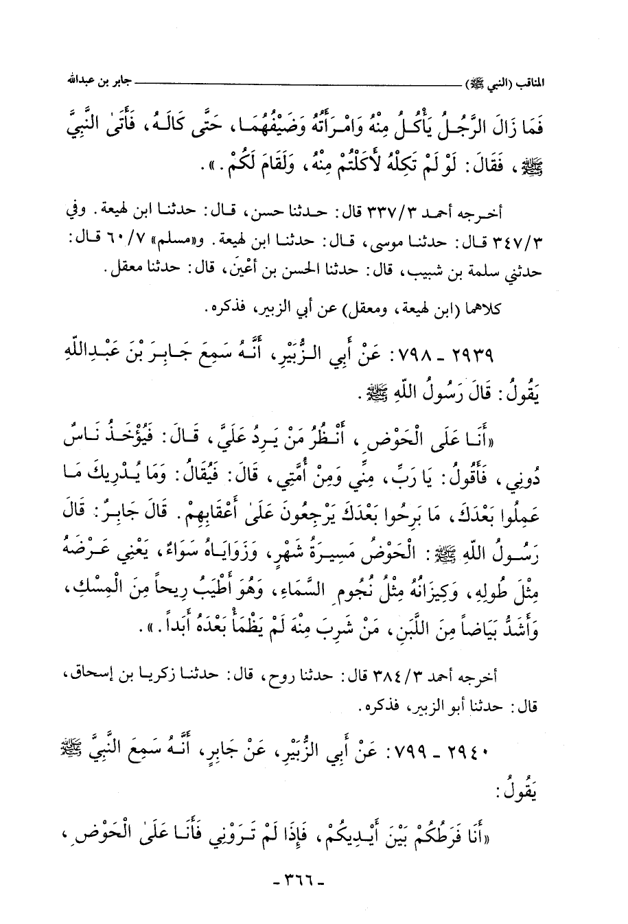 أَنَا عَلَى الْحَوْضِ، أَنْظُرُ مَنْ يَرِدُ عَلَيَّ، قَالَ: فَيُؤْخَذُ نَاسٌ دُونِي، فَأَقُولُ: يَا رَبِّ، مِنِّي وَمِنْ أُمَّتِي، قَالَ: فَيُقَالُ: وَمَا يُدْرِيكَ مَا عَمِلُوا بَعْدَكَ؟ مَا بَرِحُوا بَعْدَكَ يَرْجِعُونَ عَلَى أَعْقَابِهِمْ. قَالَ جَابِرٌ: قَالَ رَسُولُ اللهِ صلى الله عليه وسلم: الْحَوْضُ مَسِيرَةُ شَهْرٍ، وَزَوَايَاهُ سَوَاءٌ، يَعْنِي عَرْضُهُ مِثْلُ طُولِهِ، وَكِيزَانُهُ مِثْلُ نُجُومِ السَّمَاءِ، وَهُوَ أَطْيَبُ رِيحًا مِنَ الْمِسْكِ، وَأَشَدُّ بَيَاضًا مِنَ اللَّبَنِ، مَنْ شَرِبَ مِنْهُ لَمْ يَظْمَأْ بَعْدَهُ أَبَدًا.