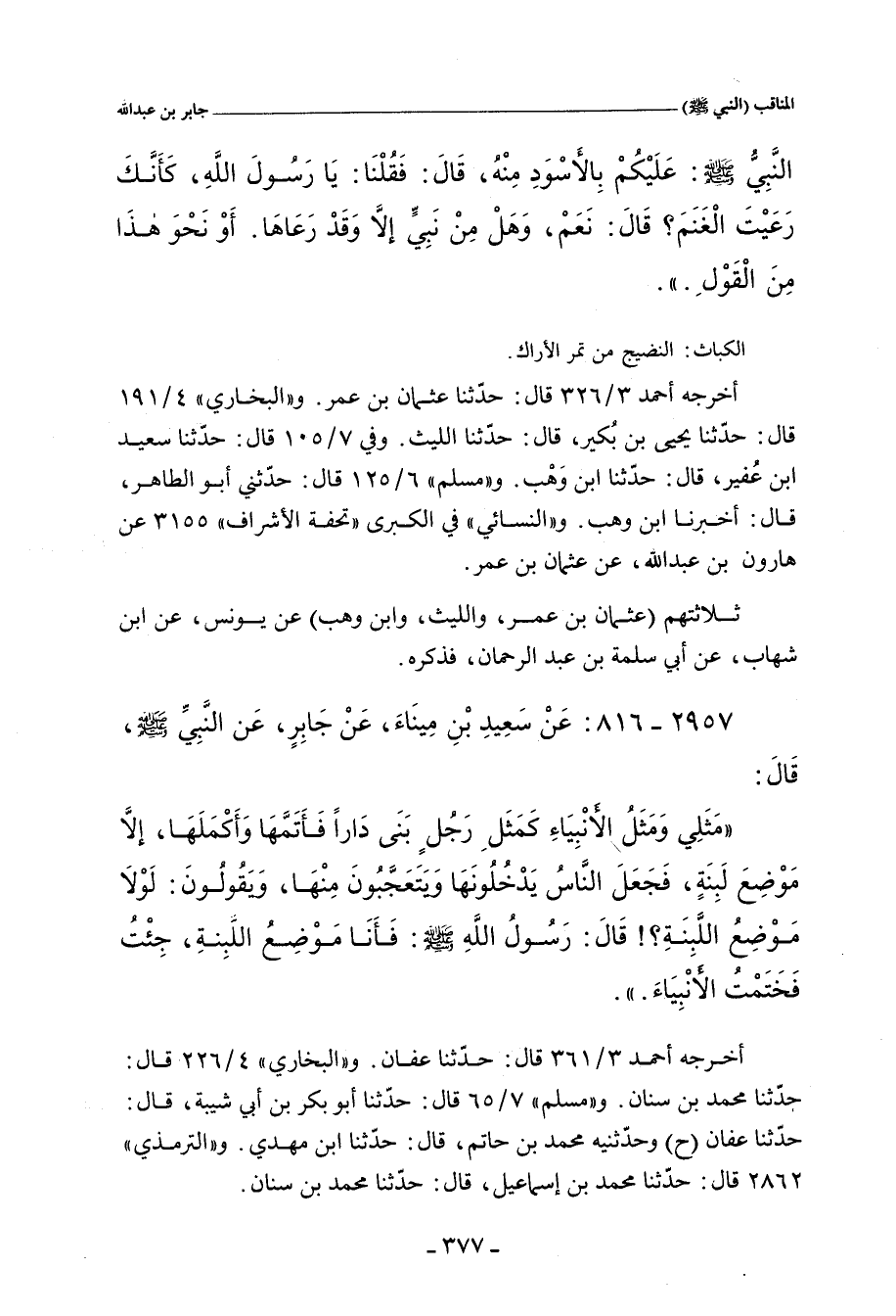 النَّبِيُّ صلى الله عليه وسلم: عَلَيْكُمْ بِالأَسْوَدِ مِنْهُ، قَالَ: فَقُلْنَا: يَا رَسُولَ اللهِ، كَأَنَّكَ رَعَيْتَ الْغَنَمَ؟ قَالَ: نَعَمْ، وَهَلْ مِنْ نَبِيٍّ إِلَاّ وَقَدْ رَعَاهَا.