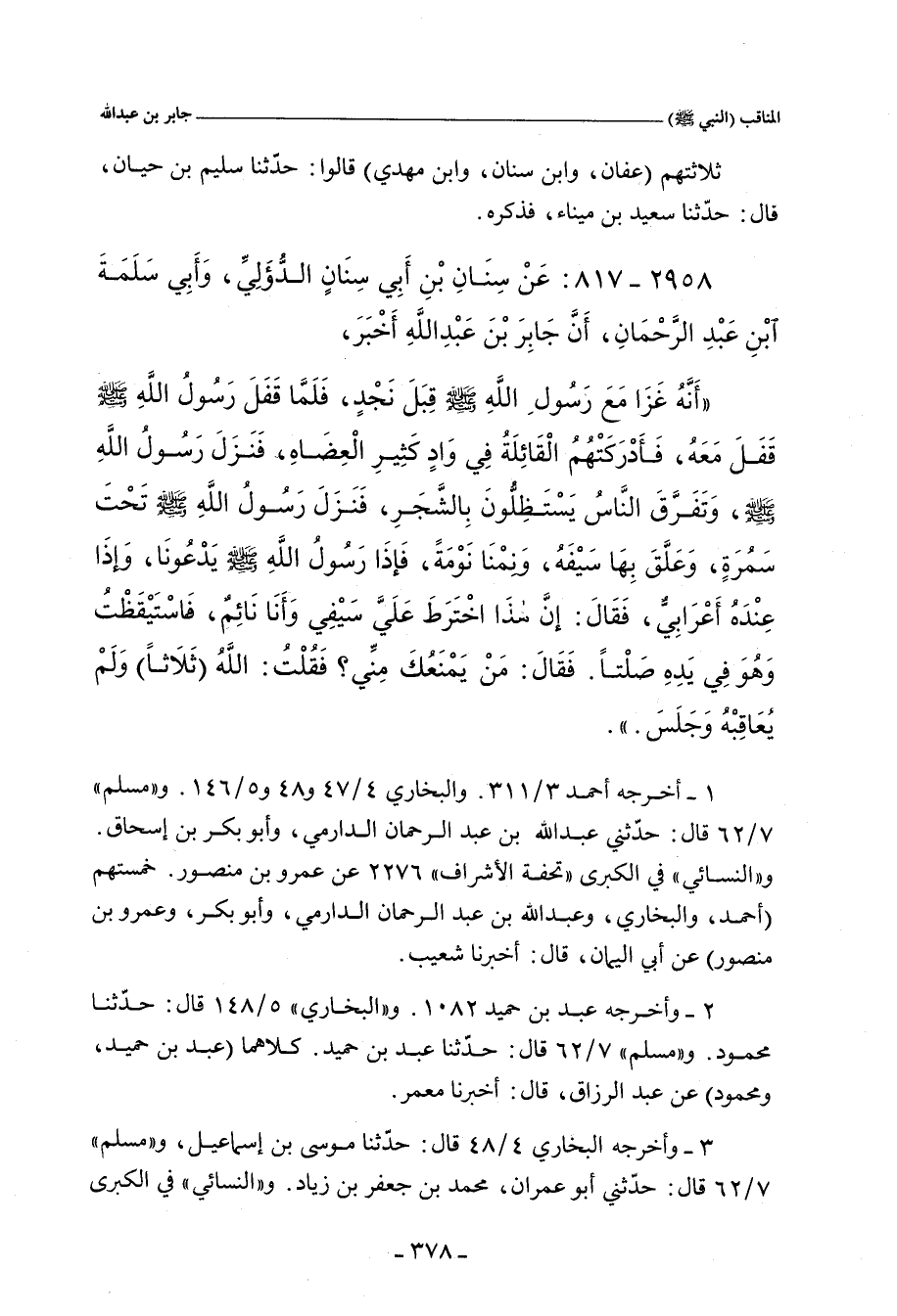 أَنَّهُ غَزَا مَعَ رَسُولِ اللهِ صلى الله عليه وسلم غَزْوَةً قِبَلَ نَجْدٍ، فَلَمَّا قَفَلَ رَسُولُ اللهِ صلى الله عليه وسلم قَفَلَ مَعَهُمْ، فَأَدْرَكَتْهُمُ الْقَائِلَةُ يَوْمًا، فِي وَادٍ كَثِيرِ الْعِضَاهِ، فَنَزَلَ النَّبِيُّ صلى الله عليه وسلم، وَتَفَرَّقَ النَّاسُ فِي الْعِضَاهِ، يَسْتَظِلُّونَ بِالشَّجَرِ، وَنَزَلَ رَسُولُ اللهِ صلى الله عليه وسلم يَسْتَظِلُّ تَحْتَ شَجَرَةٍ، فَعَلَّقَ بِهَا سَيْفَهُ، قَالَ جَابِرٌ: فَنِمْنَا بِهَا نَوْمَةً، ثُمَّ إِنَّ النَّبِيَّ صلى الله عليه وسلم يَدْعُونَا، فَأَتَيْنَاهُ، فَإِذَا عِنْدَهُ أَعْرَابِيٌّ جَالِسٌ، فَقَالَ رَسُولُ اللهِ صلى الله عليه وسلم: إِنَّ هَذَا اخْتَرَطَ سَيْفَهُ، وَأَنَا نَائِمٌ، فَاسْتَيْقَظْتُ وَهُوَ فِي يَدِهِ صَلْتًا، فَقَالَ: مَنْ يَمْنَعُكَ مِنِّي؟ فَقُلْتُ: اللهُ، فَقَالَ: مَنْ يَمْنَعُكَ مِنِّي؟ فَقُلْتُ: اللهُ، فَشَامَ السَّيْفَ، وَجَلَسَ، فَلَمْ يُعَاقِبْهُ النَّبِيُّ صلى الله عليه وسلم، وَقَدْ فَعَلَ ذَلِكَ.