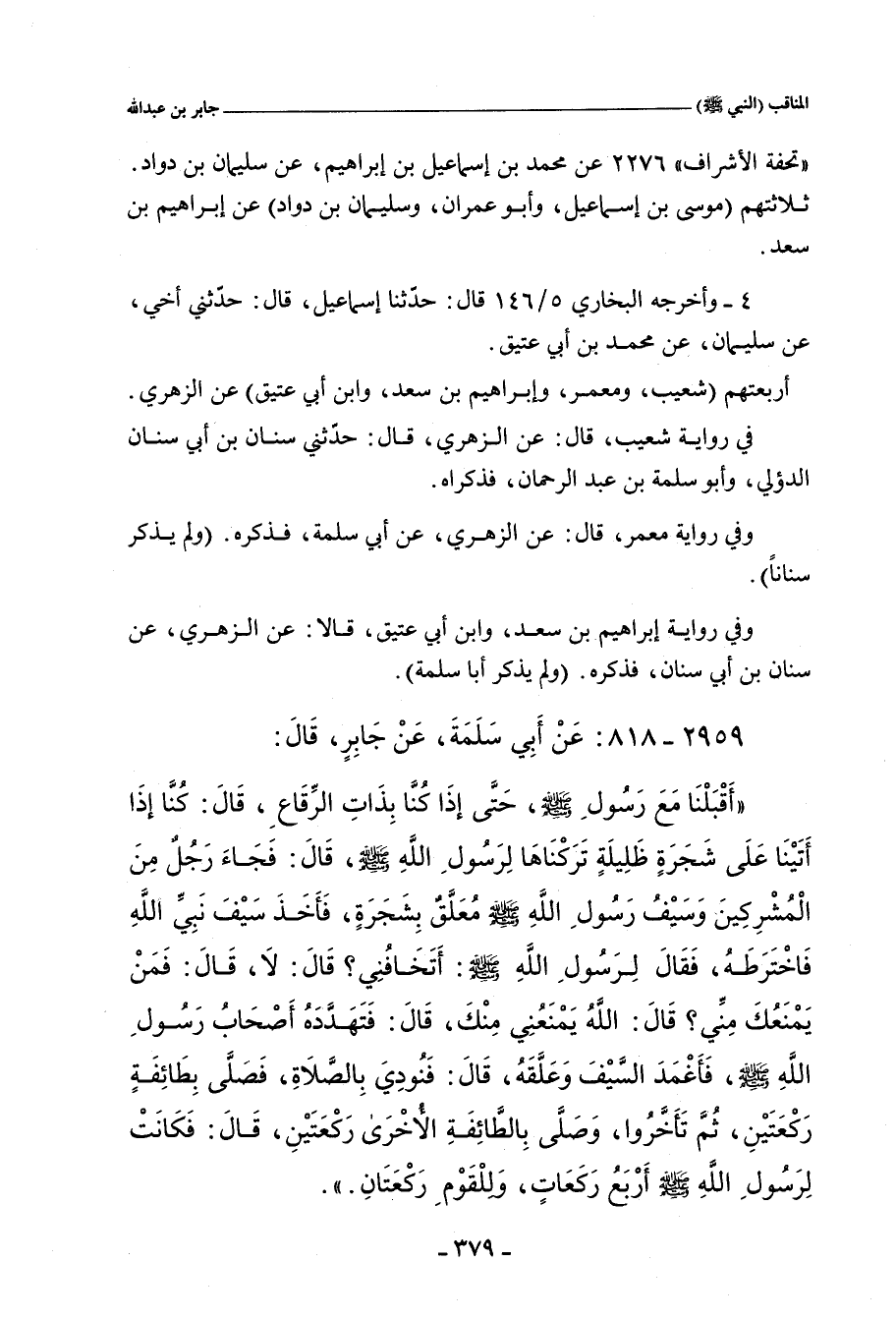 - لفظ مُعَاوِيَة بن سَلَاّم: عَنْ جَابِرٍ، أَنَّهُ صَلَّى مَعَ رَسُولِ اللهِ صلى الله عليه وسلم صَلَاةَ الْخَوْفِ، فَصَلَّى رَسُولُ اللهِ صلى الله عليه وسلم بِإِحْدَى الطَّائِفَتَيْنِ رَكْعَتَيْنِ، ثُمَّ صَلَّى بِالطَّائِفَةِ الأُخْرَى رَكْعَتَيْنِ، فَصَلَّى رَسُولُ اللهِ صلى الله عليه وسلم أَرْبَعَ رَكَعَاتٍ، وَصَلَّى بِكُلِّ طَائِفَةٍ رَكْعَتَيْنِ.
