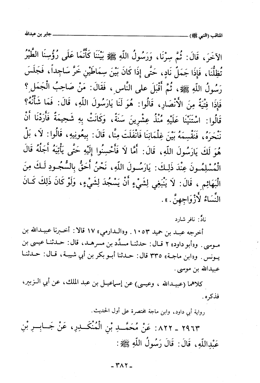 سِرْنَا، وَرَسُولُ اللهِ صلى الله عليه وسلم بَيْنَنَا، كَأَنَّمَا عَلَيْنَا الطَّيْرُ تُظِلُّنَا، فَإِذَا جَمَلٌ نَادٌّ، حَتَّى إِذَا كَانَ بَيْنَ سِمَاطَيْنِ خَرَّ سَاجِدًا، فَجَلَسَ رَسُولَ اللهِ صلى الله عليه وسلم، ثُمَّ قَالَ عَلَيَّ النَّاسَ، فَقَالَ: مَنْ صَاحِبُ الْجَمَلِ؟ فَإِذَا فِتْيَةٌ مِنَ الأَنْصَارِ، قَالُوا: هُوَ لَنَا يَا رَسُولَ اللهِ، قَالَ: فَمَا شَأْنُهُ؟ قَالُوا: اسْتَنَيْنَا عَلَيْهِ مُنْذُ عِشْرِينَ سَنَةً، وَكَانَتْ بِهِ شُحَيْمَةٌ، فَأَرَدْنَا أَنْ نَنْحَرَهُ، فَنَقْسِمَهُ بَيْنَ غِلْمَانِنَا، فَانْفَلَتَ مِنَّا، قَالَ: بِيعُونِيهِ، قَالُوا: لَا، بَلْ هُوَ لَكَ يَا رَسُولَ اللهِ، قَالَ: أَمَّا لِي، فَأَحْسِنُوا إِلَيْهِ حَتَّى يَأْتِيَهُ أَجَلُهُ، قَالَ الْمُسْلِمُونَ عِنْدَ ذَلِكَ: يَا رَسُولَ اللهِ، نَحْنُ أَحَقُّ بِالسُّجُودِ لَكَ مِنَ الْبَهَائِمِ، قَالَ: لَا يَنْبَغِي لِشَيْءٍ أَنْ يَسْجُدَ لِشَيْءٍ، وَلَوْ كَانَ ذَلِكَ، كَانَ النِّسَاءُ لأَزْوَاجِهِنَّ.