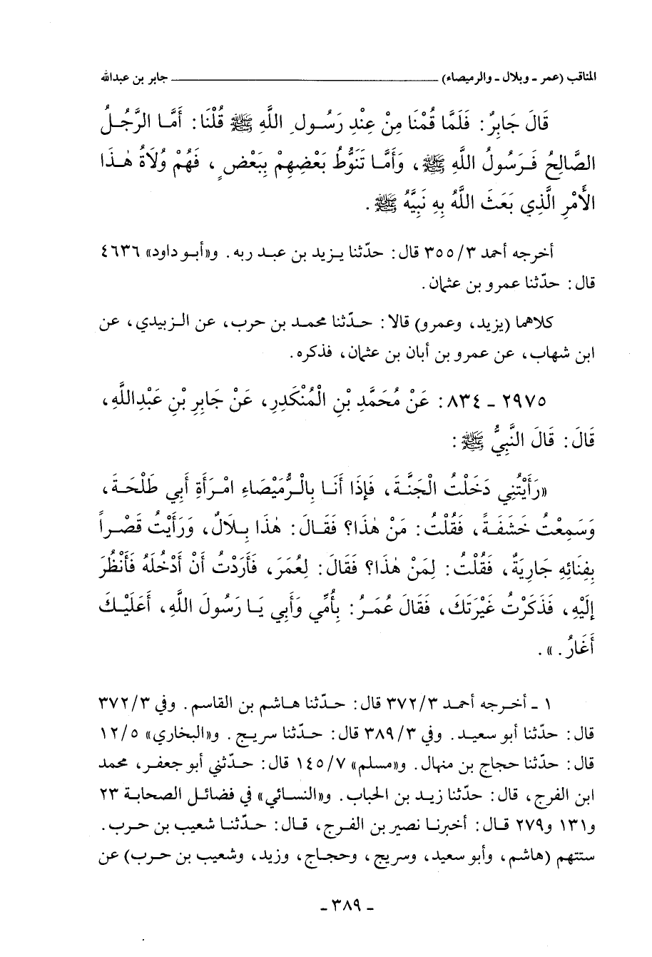 خمستهم (أحمد، وعَبْد اللهِ بن نُمَيْر، وزُهَيْر، وإِسْحَاق، وقُتَيْبَة) عن سُفْيان بن عُيَيْنَة، عَنْ عَمْرٍو، وابْنِ الْمُنْكَدِرِ، سَمِعَا جَابِرًا، يَزِيدُ أَحَدُهُمَا عَلَى الآخَرِ، قَالَ: قَالَ النَّبِيُّ صلى الله عليه وسلم: