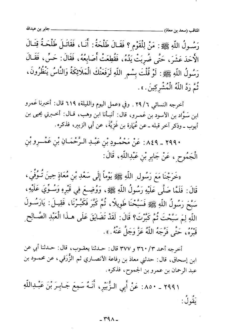 ٢٩٩٠ - عَنْ مَحْمُودِ بْنِ عَبْدِ الرَّحْمَانِ بْنِ عَمْرِو بْنِ الْجَمُوحِ، عَنْ جَابِرِ بْنِ عَبْدِ اللهِ الأَنْصَارِيِّ، قَالَ: