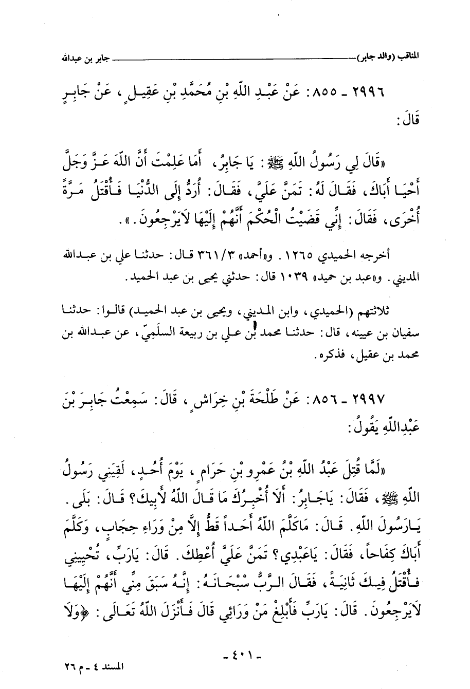 لَمَّا قُتِلَ عَبْدُ اللهِ بْنُ عَمْرِو بْنِ حَرَامٍ، يَوْمَ أُحُدٍ، لَقِيَنِي رَسُولُ اللهِ صلى الله عليه وسلم، فَقَالَ: يَا جَابِرُ، أَلَا أُخْبِرُكَ مَا قَالَ اللهُ لأَبِيكَ؟ (وَقَالَ يَحْيَى فِي حَدِيثِهِ: فَقَالَ: يَا جَابِرُ، مَا لِي أَرَاكَ مُنْكَسِرًا؟ قَالَ: قُلْتُ: يَا رَسُولَ اللهِ، اسْتُشْهِدَ أَبِي وَتَرَكَ عِيَالاً وَدَيْنًا، قَالَ: أَفَلَا أُبَشِّرُكَ بِمَا لَقِيَ اللهُ بِهِ أَبَاكَ؟) قَالَ: بَلَى، يَا رَسُولَ اللهِ، قَالَ: مَا كَلَّمَ اللهُ أَحَدًا قَطُّ إِلَاّ مِنْ وَرَاءِ حِجَابٍ، وَكَلَّمَ أَبَاكَ كِفَاحًا، فَقَالَ: يَا عَبْدِي، تَمَنَّ عَلَيَّ أُعْطِكَ، قَالَ: يَا رَبِّ، تُحْيِينِي فَأُقْتَلُ فِيكَ ثَانِيَةً، فَقَالَ الرَّبُّ سُبْحَانَهُ: إِنَّهُ سَبَقَ مِنِّي أَنَّهُمْ إِلَيْهَا لَا يَرْجِعُونَ، قَالَ: يَا رَبِّ، فَأَبْلِغْ مَنْ وَرَائِي، قَالَ: فَأَنْزَلَ اللهُ، تَعَالَى: (وَلَا