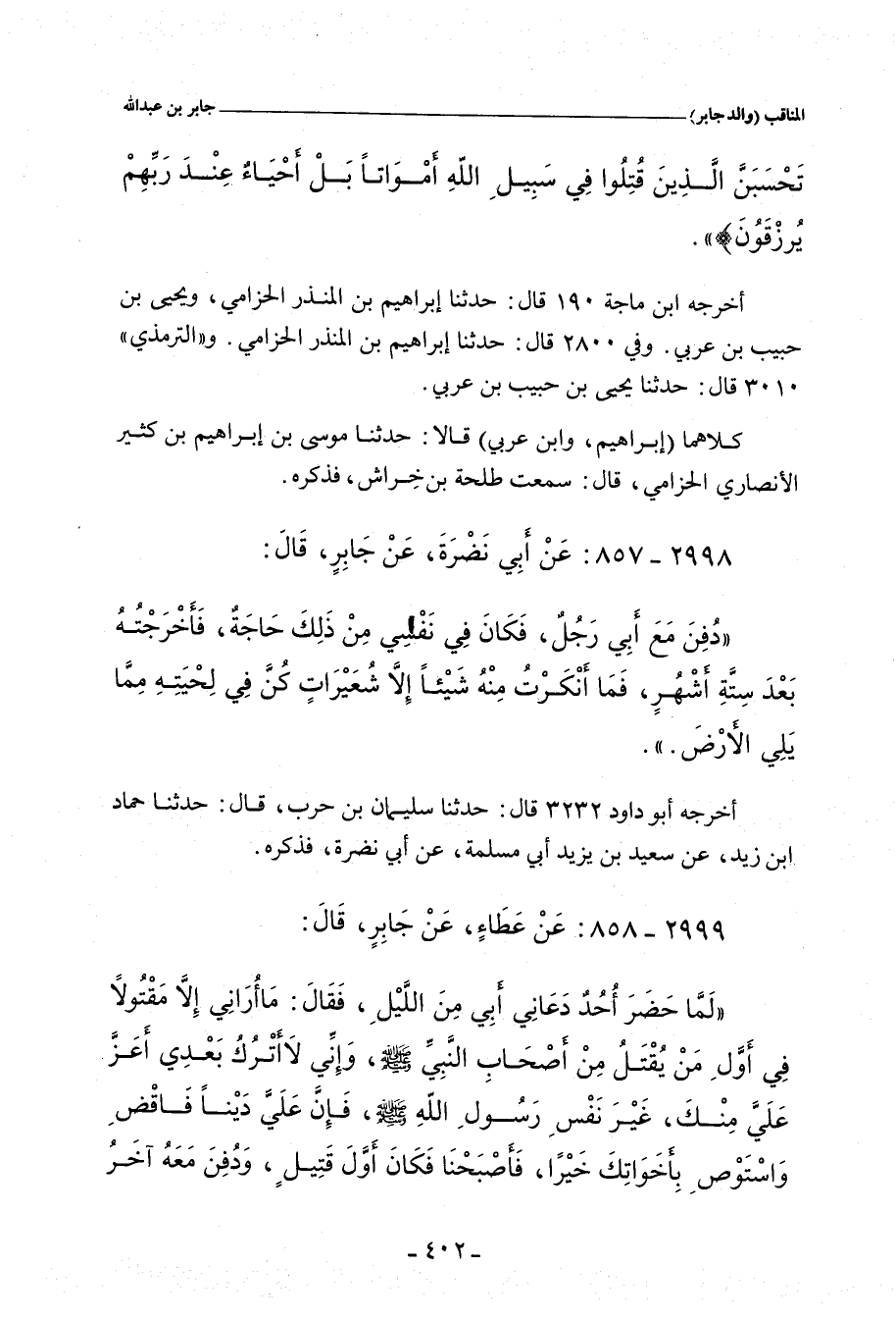 لَمَّا حَضَرَ أُحُدٌ، دَعَانِي أَبِي مِنْ اللَّيْلِ، فَقَالَ: مَا أُرَانِي إِلَاّ مَقْتُولاً فِي أَوَّلِ مَنْ يُقْتَلُ مِنْ أَصْحَابِ النَّبِيِّ صلى الله عليه وسلم، وَإِنِّي لَا أَتْرُكُ بَعْدِي أَعَزَّ عَلَيَّ مِنْكَ، غَيْرَ نَفْسِ رَسُولِ اللهِ صلى الله عليه وسلم، فَإِنَّ عَلَيَّ دَيْنًا فَاقْضِ، وَاسْتَوْصِ بِأَخَوَاتِكَ خَيْرًا، فَأَصْبَحْنَا فَكَانَ أَوَّلَ قَتِيلٍ، وَدُفِنَ مَعَهُ آخَرُ