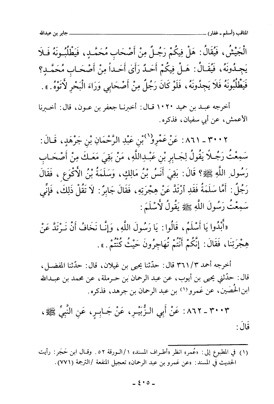 ٣٠٠٢ - عَنْ عَمْرِو بْنِ عَبْدِ الرَّحْمَانِ بْنِ جَرْهَدٍ، قَالَ: سَمِعْتُ رَجُلاً يَقُولُ لِجَابِرِ ابْنِ عَبْدِ اللهِ: مَنْ بَقِيَ مَعَكَ مِنْ أَصْحَابِ رَسُولِ اللهِ صلى الله عليه وسلم؟ قَالَ: بَقِيَ أَنَسُ بْنُ مَالِكٍ، وَسَلَمَةُ بْنُ الأَكْوَعِ، فَقَالَ رَجُلٌ: أَمَّا سَلَمَةُ فَقَدِ ارْتَدَّ عَنْ هِجْرَتِهِ، فَقَالَ جَابِرٌ: لَا تَقُلْ ذَلِكَ، فَإِنِّي سَمِعْتُ رَسُولَ اللهِ صلى الله عليه وسلم يَقُولُ لأَسْلَمَ: