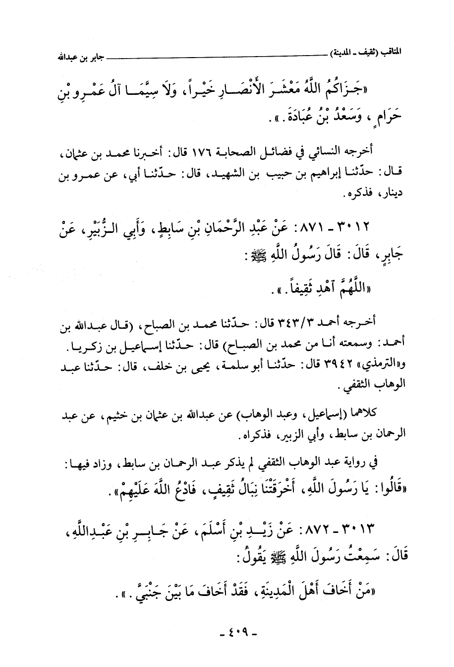 - لفظ التِّرْمِذِي: عَنْ جَابِرٍ، قَالَ: قَالُوا: يَا رَسُولَ اللهِ، أَحْرَقَتْنَا نِبَالُ ثَقِيفٍ، فَادْعُ اللهَ عَلَيْهِمْ، قَالَ: اللَّهُمَّ اهْدِ ثَقِيفًا.