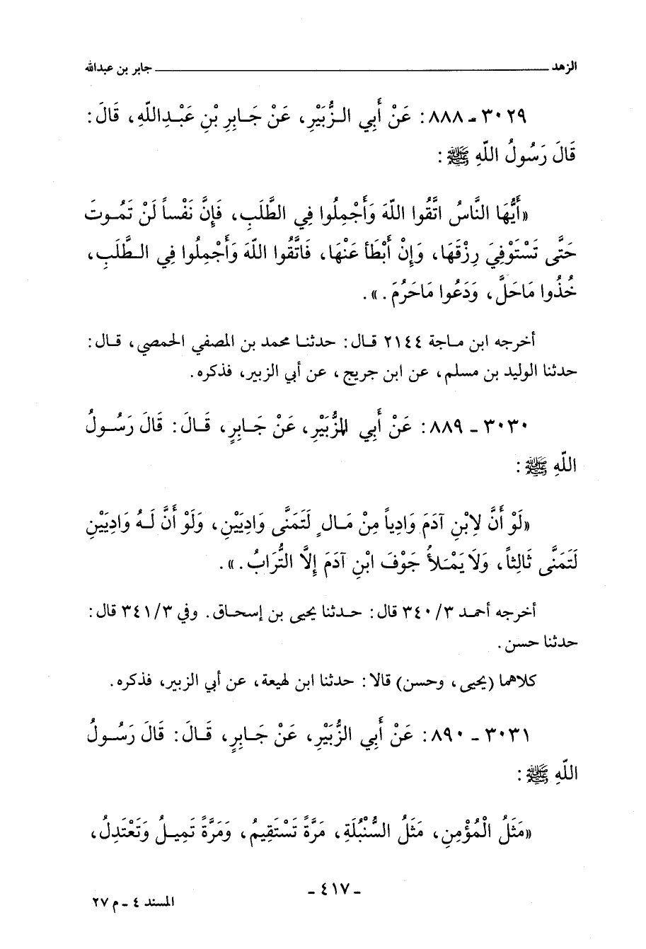- وفي رواية: عَنْ أَبِي الزُّبَيْرِ، أَنَّهُ سَأَلَ جَابِرًا: أَقَالَ رَسُولُ اللهِ صلى الله عليه وسلم: لَوْ كَانَ لاِبْنِ آدَمَ وَادٍ، تَمَنَّى آخَرَ؟ فَقَالَ جَابِرٌ: سَمِعْتُ رَسُولَ اللهِ صلى الله عليه وسلم يَقُولُ: