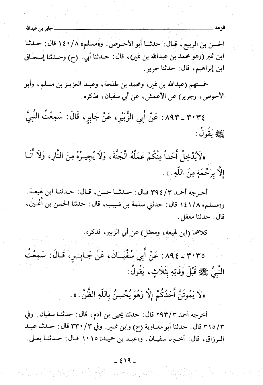 - وفي رواية: سَمِعْتُ النَّبِيَّ صلى الله عليه وسلم يَقُولُ، قَبْلَ مَوْتِهِ بِثَلَاثٍ: مَنِ اسْتَطَاعَ مِنْكُمْ أَنْ لَا يَمُوتَ، إِلَاّ وَظَنُّهُ بِاللهِ حَسَنٌ، فَلْيَفْعَلْ.