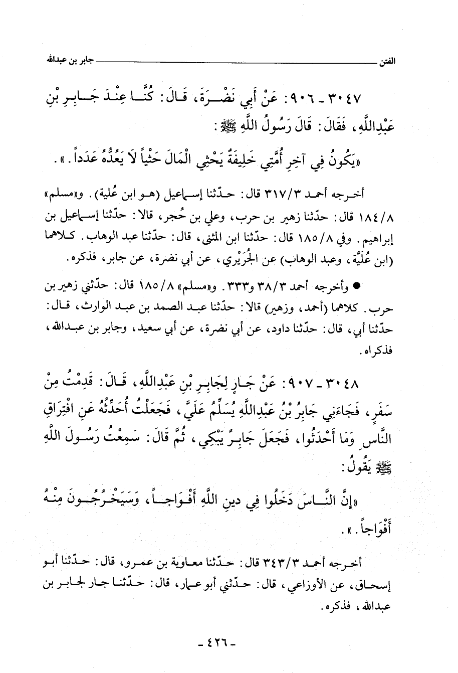 ٣٠٤٨ - عَنْ جَارٍ لِجَابِرِ بْنِ عَبْدِ اللهِ، قَالَ: قَدِمْتُ مِنْ سَفَرٍ، فَجَاءَنِي جَابِرُ بْنُ عَبْدِ اللهِ يُسَلِّمُ عَلَيَّ، فَجَعَلْتُ أُحَدِّثُهُ عَنِ افْتِرَاقِ النَّاسِ وَمَا أَحْدَثُوا، فَجَعَلَ جَابِرٌ يَبْكِي، ثُمَّ قَالَ: سَمِعْتُ رَسُولَ اللهِ صلى الله عليه وسلم يَقُولُ: