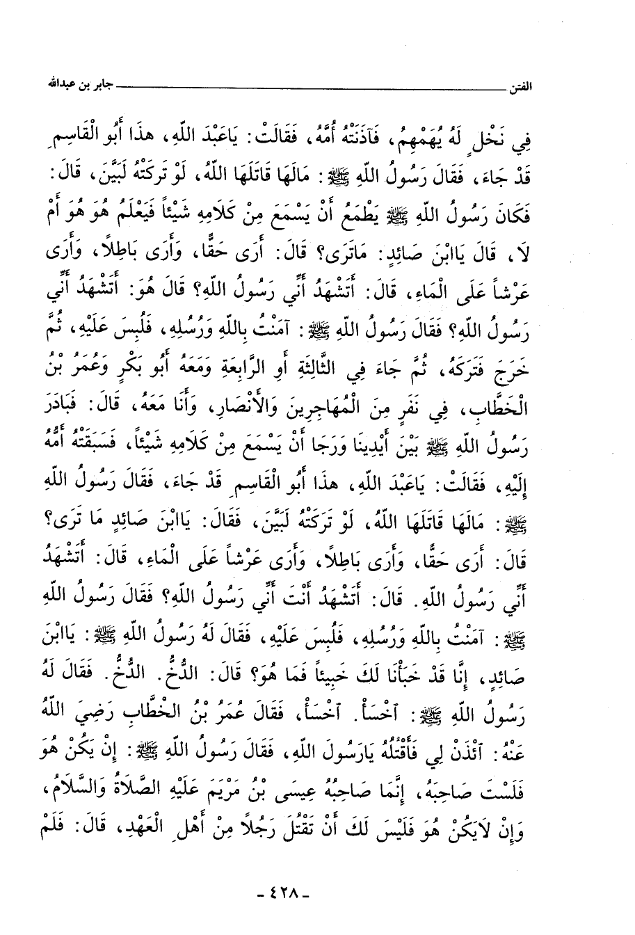 وَجَاءَ فِي الثَّالِثَةِ، أَوِ الرَّابِعَةِ، وَمَعَهُ أَبُو بَكْرٍ وَعُمَرُ بْنُ الْخَطَّابِ، فِي نَفَرٍ مِنْ الْمُهَاجِرِينَ وَالأَنْصَارِ، وَأَنَا مَعَهُ، قَالَ: فَبَادَرَ رَسُولُ اللهِ صلى الله عليه وسلم بَيْنَ أَيْدِينَا، وَرَجَا أَنْ يَسْمَعَ مِنْ كَلَامِهِ شَيْئًا، فَسَبَقَتْهُ أُمُّهُ إِلَيْهِ، فَقَالَتْ: يَا عَبْدَ اللهِ، هَذَا أَبُو الْقَاسِمِ قَدْ جَاءَ، فَقَالَ رَسُولُ اللهِ صلى الله عليه وسلم: مَا لَهَا قَاتَلَهَا اللهُ، لَوْ تَرَكَتْهُ لَبَيَّنَ، فَقَالَ: يَا ابْنَ صَائِدٍ، مَا تَرَى؟ قَالَ: أَرَى حَقًّا، وَأَرَى بَاطِلاً، وَأَرَى عَرْشًا عَلَى الْمَاءِ، قَالَ: أَتَشْهَدُ أَنِّي رَسُولُ اللهِ؟ قَالَ: أَتَشْهَدُ أَنْتَ أَنِّي رَسُولُ اللهِ؟ فَقَالَ رَسُولُ اللهِ صلى الله عليه وسلم: آمَنْتُ بِاللهِ وَرُسُلِهِ، فَلُبِسَ عَلَيْهِ، فَقَالَ لَهُ رَسُولُ اللهِ صلى الله عليه وسلم: يَا ابْنَ صَائِدٍ، إِنَّا قَدْ خَبَّأْنَا لَكَ خَبِيئًا، فَمَا هُوَ؟ قَالَ: الدُّخُّ. الدُّخُّ، فَقَالَ لَهُ رَسُولُ اللهِ صلى الله عليه وسلم: اخْسَأْ، اخْسَأْ، فَقَالَ عُمَرُ بْنُ الْخَطَّابِ، رَضِيَ اللهُ عَنْهُ: ائْذَنْ لِي فَأَقْتُلَهُ يَا رَسُولَ اللهِ، فَقَالَ رَسُولُ اللهِ صلى الله عليه وسلم: إِنْ يَكُنْ هُوَ فَلَسْتَ صَاحِبَهُ، إِنَّمَا صَاحِبُهُ عِيسَى ابْنُ مَرْيَمَ، عَلَيْهِ الصَّلَاةُ وَالسَّلَامُ، وَإِنْ لَا يَكُنْ هُوَ، فَلَيْسَ لَكَ أَنْ تَقْتُلَ رَجُلاً مِنْ أَهْلِ الْعَهْدِ، قَالَ: فَلَمْ