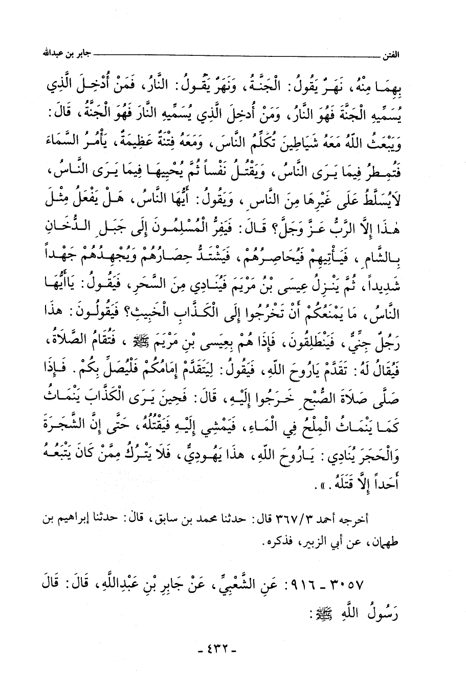 فَيَشْتَدُّ حِصَارُهُمْ، وَيُجْهِدُهُمْ جَهْدًا شَدِيدًا، ثُمَّ يَنْزِلُ عِيسَى ابْنُ مَرْيَمَ فَيُنَادِي مِنَ السَّحَرِ، فَيَقُولُ: يَا أَيُّهَا النَّاسُ، مَا يَمْنَعُكُمْ أَنْ تَخْرُجُوا إِلَى الْكَذَّابِ الْخَبِيثِ؟ فَيَقُولُونَ: هَذَا رَجُلٌ جِنِّيٌّ، فَيَنْطَلِقُونَ، فَإِذَا هُمْ بِعِيسَى ابْنِ مَرْيَمَ صلى الله عليه وسلم، فَتُقَامُ الصَّلَاةُ، فَيُقَالُ لَهُ: تَقَدَّمْ يَا رُوحَ اللهِ، فَيَقُولُ: لِيَتَقَدَّمْ إِمَامُكُمْ فَلْيُصَلِّ بِكُمْ، فَإِذَا صَلَّى صَلَاةَ الصُّبْحِ خَرَجُوا إِلَيْهِ، قَالَ: فَحِينَ يَرَى الْكَذَّابُ يَنْمَاثُ كَمَا يَنْمَاثُ الْمِلْحُ فِي الْمَاءِ، فَيَمْشِي إِلَيْهِ فَيَقْتُلُهُ، حَتَّى إِنَّ الشَّجَرَةَ وَالْحَجَرَ يُنَادِي: يَا رُوحَ اللهِ، هَذَا يَهُودِيٌّ، فَلَا يَتْرُكُ مِمَّنْ كَانَ يَتْبَعُهُ أَحَدًا إِلَاّ قَتَلَهُ.