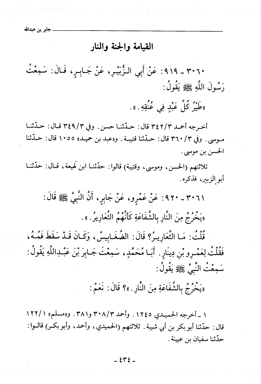 - لفظ الباقين: عَنْ حَمَّادِ بْنِ زَيْدٍ، قَالَ: قُلْتُ لِعَمْرِو بْنِ دِينَارٍ: أَسَمِعْتَ جَابِرَ بْنَ عَبْدِ اللهِ يُحَدِّثُ، عَنْ رَسُولِ اللهِ صلى الله عليه وسلم؛ إِنَّ اللهَ يُخْرِجُ قَوْمًا مِنَ النَّارِ بِالشَّفَاعَةِ؟ قَالَ: نَعَمْ.