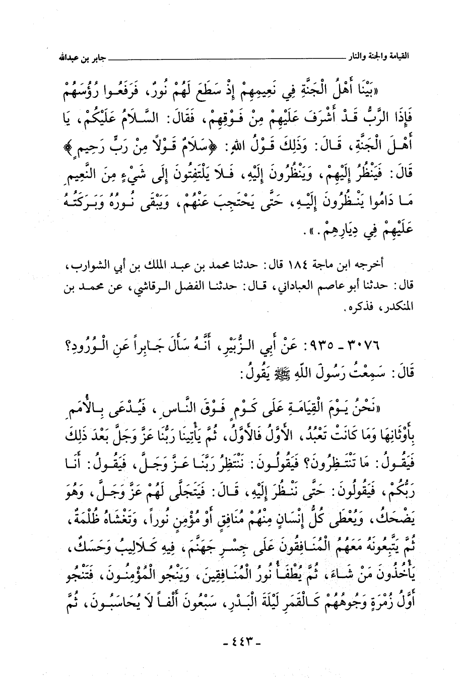 بَيْنَا أَهْلُ الْجَنَّةِ فِي نَعِيمِهِمْ إِذْ سَطَعَ لَهُمْ نُورٌ، فَرَفَعُوا رُؤُوسَهُمْ، فَإِذَا الرَّبُّ قَدْ أَشْرَفَ عَلَيْهِمْ مِنْ فَوْقِهِمْ، فَقَالَ: السَّلَامُ عَلَيْكُمْ، يَا أَهْلَ الْجَنَّةِ، قَالَ: وَذَلِكَ قَوْلُ اللهِ: (سَلَامٌ قَوْلاً مِنْ رَبٍّ رَحِيمٍ) قَالَ: فَيَنْظُرُ إِلَيْهِمْ، وَيَنْظُرُونَ إِلَيْهِ، فَلَا يَلْتَفِتُونَ إِلَى شَيْءٍ مِنَ النَّعِيمِ مَا دَامُوا يَنْظُرُونَ إِلَيْهِ، حَتَّى يَحْتَجِبَ عَنْهُمْ، وَيَبْقَى نُورُهُ وَبَرَكَتُهُ عَلَيْهِمْ فِي دِيَارِهِمْ.