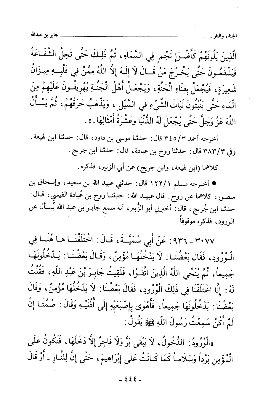 - أخرجه مُسْلم ١/ ١٢٢ (٣٨٨) قال: حدَّثني عُبَيْد اللهِ بن سَعِيد، وإِسْحَاق بن مَنْصُور، كلاهما عن رَوْح. قال عُبَيْد اللهِ: حدَّثنا رَوْح بن عُبَادَة القَيْسِي، حدَّثنا ابن جُرَيْج، قال: أخبرني أَبُو الزُّبَيْرِ، أَنَّهُ سَمِعَ جَابِرَ بْنَ عَبْدِ اللهِ يُسْأَلُ عَنِ الْوُرُودِ؟ فَقَالَ: نَجِيءُ نَحْنُ يَوْمَ الْقِيَامَةِ عَنْ (كَذَا وَكَذَا انْظُرْ أَيْ ذَلِكَ) فَوْقَ النَّاسِ، قَالَ: فَتُدْعَى الأُمَمُ بِأَوْثَانِهَا، وَمَا كَانَتْ تَعْبُدُ، الأَوَّلُ فَالأَوَّلُ، ثُمَّ يَأْتِينَا رَبُّنَا بَعْدَ ذَلِكَ، فَيَقُولُ: مَنْ تَنْظُرُونَ؟ فَيَقُولُونَ: نَنْظُرُ رَبَّنَا، فَيَقُولُ: أَنَا رَبُّكُمْ، فَيَقُولُونَ: حَتَّى نَنْظُرَ إِلَيْكَ، فَيَتَجَلَّى لَهُمْ يَضْحَكُ، قَالَ: فَيَنْطَلِقُ بِهِمْ وَيَتَّبِعُونَهُ، وَيُعْطَى كُلُّ إِنْسَانٍ مِنْهُمْ - مُنَافِقٍ، أَوْ مُؤْمِنٍ - نُورًا، ثُمَّ يَتَّبِعُونَهُ، وَعَلَى جِسْرِ جَهَنَّمَ كَلَالِيبُ وَحَسَكٌ، تَأْخُذُ مَنْ شَاءَ اللهُ، ثُمَّ يَُطْفَأُ نُورُ الْمُنَافِقِينَ، ثُمَّ يَنْجُو الْمُؤْمِنُونَ، فَتَنْجُو أَوَّلُ زُمْرَةٍ وُجُوهُهُمْ كَالْقَمَرِ لَيْلَةَ الْبَدْرِ، سَبْعُونَ أَلْفًا لَا يُحَاسَبُونَ، ثُمَّ الَّذِينَ يَلُونَهُمْ كَأَضْوَإِ نَجْمٍ فِي السَّمَاءِ، ثُمَّ كَذَلِكَ، ثُمَّ تَحِلُّ الشَّفَاعَةُ وَيَشْفَعُونَ، حَتَّى يَخْرُجَ مِنَ النَّارِ مَنْ قَالَ: لَا إِلَهَ إِلَاّ اللهُ، وَكَانَ فِي قَلْبِهِ مِنَ الْخَيْرِ مَا يَزِنُ شَعِيرَةً، فَيُجْعَلُونَ بِفِنَاءِ الْجَنَّةِ،