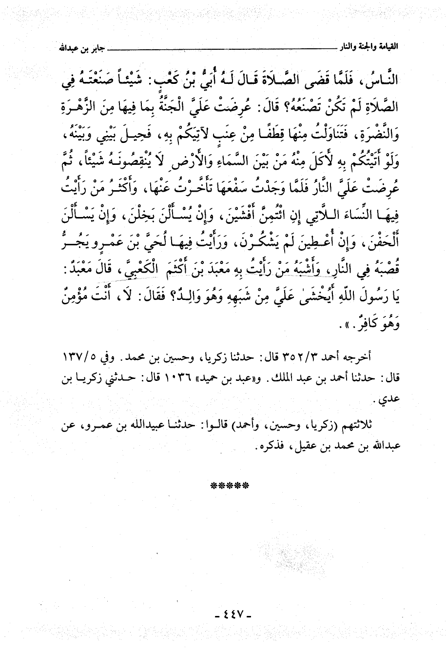 - لفظ أحمد بن عَبْد الملك: بَيْنَا نَحْنُ صُفُوفًا خَلْفَ رَسُولِ اللهِ صلى الله عليه وسلم فِي الظُّهْرِ، أَوِ الْعَصْرِ، إِذْ رَأَيْنَاهُ يَتَنَاوَلُ شَيْئًا بَيْنَ يَدَيْهِ، وَهُوَ فِي الصَّلَاةِ لِيَأْخُذَهُ، ثُمَّ تَنَاوَلَهُ لِيَأْخُذَهُ، ثُمَّ حِيلَ بَيْنَهُ وَبَيْنَهُ، ثُمَّ تَأَخَّرَ وَتَأَخَّرْنَا، ثُمَّ تَأَخَّرَ الثَّانِيَةَ وَتَأَخَّرْنَا، فَلَمَّا سَلَّمَ قَالَ أُبَيُّ بْنُ كَعْبٍ، رَضِيَ اللهُ عَنْهُ: يَا رَسُولَ اللهِ، رَأَيْنَاكَ الْيَوْمَ تَصْنَعُ فِي صَلَاتِكَ شَيْئًا لَمْ تَكُنْ تَصْنَعُهُ؟ قَالَ: إِنَّهُ عُرِضَتْ عَلَيَّ الْجَنَّةُ بِمَا فِيهَا مِنَ الزَّهْرَةِ، فَتَنَاوَلْتُ قِطْفًا مِنْ عِنَبِهَا لآتِيَكُمْ بِهِ، وَلَوْ أَخَذْتُهُ لأَكَلَ مِنْهُ مَنْ بَيْنَ السَّمَاءِ وَالأَرْضِ لَا يَنْتَقِصُونَهُ، فَحِيلَ بَيْنِي وَبَيْنَهُ، وَعُرِضَتْ عَلَيَّ النَّارُ، فَلَمَّا وَجَدْتُ حَرَّ شُعَاعِهَا تَأَخَّرْتُ، وَأَكْثَرُ مَنْ رَأَيْتُ فِيهَا النِّسَاءُ اللَاّتِي إِنْ اؤْتُمِنَّ أَفْشَيْنَ، وَإِنْ سُئِلْنَ أَخْفَيْنَ (قَالَ أَبِي: قَالَ زَكَرِيَّا بْنُ عَدِيٍّ: أَلْحَفْنَ)، وَإِنْ أُعْطِينَ لَمْ يَشْكُرْنَ، وَرَأَيْتُ فِيهَا لُحَيَّ بْنَ عَمْرٍو يَجُرُّ قُصْبَهُ، وَأَشْبَهُ مَنْ رَأَيْتُ بِهِ مَعْبَدُ بْنُ أَكْثَمَ، قَالَ مَعْبَدٌ: أَيْ رَسُولَ اللهِ، يُخْشَى عَلَيَّ مِنْ شَبَهِهِ، فَإِنَّهُ وَالِدٌ؟ قَالَ: لَا، أَنْتَ مُؤْمِنٌ، وَهُوَ كَافِرٌ، وَهُوَ أَوَّلُ مَنْ جَمَعَ الْعَرَبَ عَلَى الأَصْنَامِ.