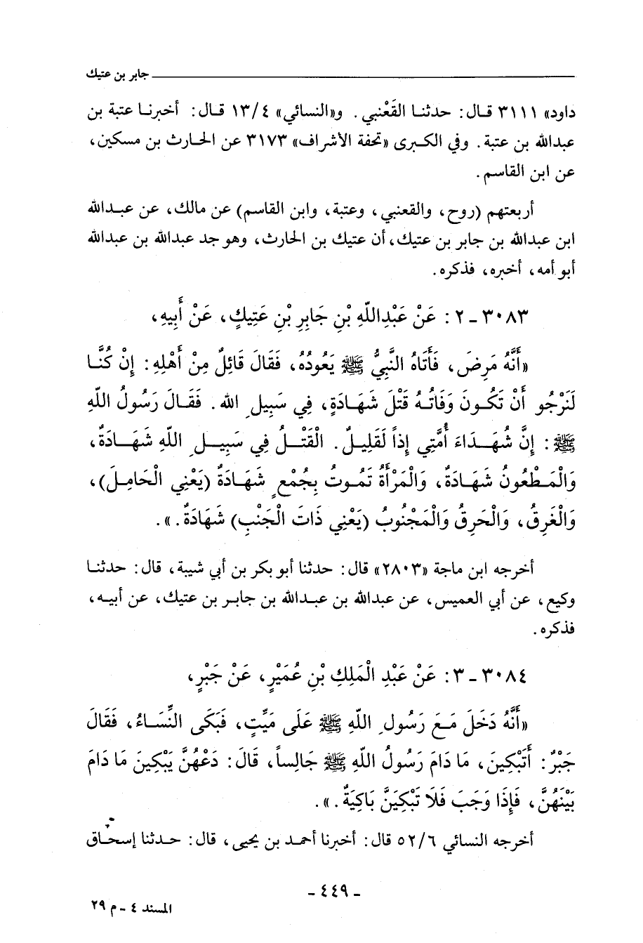 أَنَّ رَسُولَ اللهِ صلى الله عليه وسلم عَادَ جَبْرًا، فَلَمَّا دَخَلَ سَمِعَ النِّسَاءَ يَبْكِينَ، وَيَقُلْنَ: كُنَّا نَحْسُبُ وَفَاتَكَ قَتْلاً فِي سَبِيلِ اللهِ، فَقَالَ: وَمَا تَعُدُّونَ الشَّهَادَةَ إِلَاّ مَنْ قُتِلَ فِي سَبِيلِ اللهِ، إِنَّ شُهَدَاءَكُمْ إِذًا لَقَلِيلٌ، الْقَتْلُ فِي سَبِيلِ اللهِ شَهَادَةٌ، وَالْبَطْنُ شَهَادَةٌ، وَالْحَرَقُ شَهَادَةٌ، وَالْغَرَقُ شَهَادَةٌ، وَالْمَغْمُومُ، يَعْنِي الْهَدِمَ، شَهَادَةٌ، وَالْمَجْنُوبُ شَهَادَةٌ، وَالْمَرْأَةُ تَمُوتُ بِجُمْعٍ شَهِيدَةٌ، قَالَ رَجُلٌ: أَتَبْكِينَ وَرَسُولُ اللهِ صلى الله عليه وسلم قَاعِدٌ؟ قَالَ: دَعْهُنَّ، فَإِذَا وَجَبَ فَلَا تَبْكِيَنَّ عَلَيْهِ بَاكِيَةٌ.