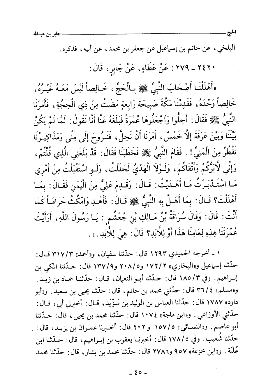 أَهْلَلْنَا أَصْحَابَ النَّبِيِّ صلى الله عليه وسلم بِالْحَجِّ، خَالِصًا لَيْسَ مَعَهُ غَيْرُهُ، خَالِصًا وَحْدَهُ، فَقَدِمْنَا مَكَّةَ صَبِيحَةَ رَابِعَةٍ مَضَتْ مِنْ ذِي الْحِجَّةِ، فَأَمَرَنَا النَّبِيُّ صلى الله عليه وسلم فَقَالَ: أَحِلُّوا وَاجْعَلُوهَا عُمْرَةً، فَبَلَغَهُ عَنَّا أَنَّا نَقُولُ: لَمَّا لَمْ يَكُنْ بَيْنَنَا وَبَيْنَ عَرَفَةَ إِلَاّ خَمْسٌ، أَمَرَنَا أَنْ نَحِلَّ، فَنَرُوحَ إِلَى مِنًى وَمَذَاكِيرُنَا تَقْطُرُ مِنَ الْمَنِيِّ! فَقَامَ النَّبِيُّ صلى الله عليه وسلم فَخَطَبَنَا، فَقَالَ: قَدْ بَلَغَنِي الَّذِي قُلْتُمْ، وَإِنِّي لأَبَرُّكُمْ وَأَتْقَاكُمْ، وَلَوْلَا الْهَدْيُ لَحَلَلْتُ، وَلَوِ اسْتَقْبَلْتُ مِنْ أَمْرِي مَا اسْتَدْبَرْتُ مَا أَهْدَيْتُ. قَالَ: وَقَدِمَ عَلِيٌّ مِنَ الْيَمَنِ فَقَالَ: بِمَا أَهْلَلْتَ؟ قَالَ: بِمَا أَهَلَّ بِهِ النَّبِيُّ صلى الله عليه وسلم. قَالَ: فَأَهْدِ وَامْكُثْ حَرَامًا كَمَا أَنْتَ. قَالَ: وَقَالَ سُرَاقَةُ بْنُ مَالِكِ بْنِ جُعْشُمٍ: يَا رَسُولَ اللهِ، أَرَأَيْتَ عُمْرَتَنَا هَذِهِ لِعَامِنَا هَذَا، أَوْ لِلأَبَدِ؟ قَالَ: هِيَ لِلأَبَدِ.