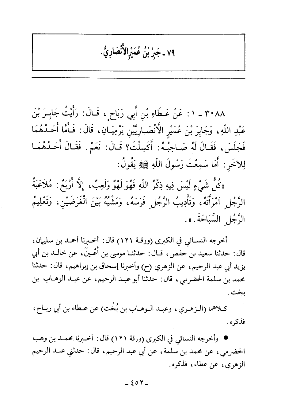 ٣٠٨٨ - عَنْ عَطَاءِ بْنِ أَبِي رَبَاحٍ، قَالَ: رَأَيْتُ جَابِرَ بْنَ عَبْدِ اللهِ، وَجَابِرَ بْنَ عُمَيْرٍ الأَنْصَارِيَّيْنِ يَرْمِيَانِ، فَقَالَ أَحَدُهُمَا لِصَاحِبِهِ: سَمِعْتُ رَسُولَ اللهِ صلى الله عليه وسلم يَقُولُ: