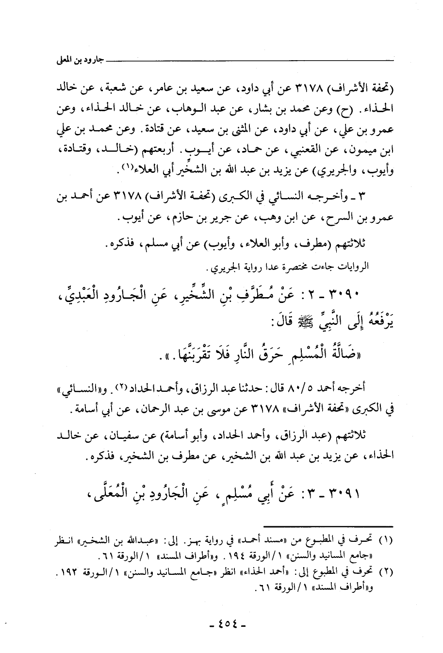 ٣٠٩٠ - عَنْ مُطَرِّفِ بْنِ الشِّخِّيرِ، عَنِ الْجَارُودِ الْعَبْدِيِّ، يَرْفَعُهُ إِلَى النَّبِيِّ صلى الله عليه وسلم، قَالَ: