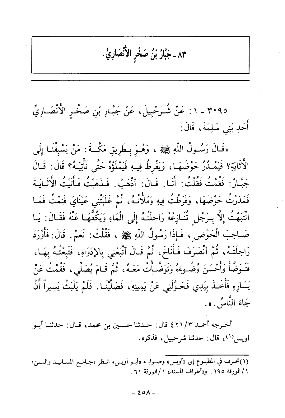 ٣٠٩٥ - عَنْ شُرَحْبِيلَ بْنِ سَعْدٍ، عَنْ جَبَّارِ بْنِ صَخْرٍ الأَنْصَارِيِّ، أَحَدِ بَنِي سَلِمَةَ، قَالَ: