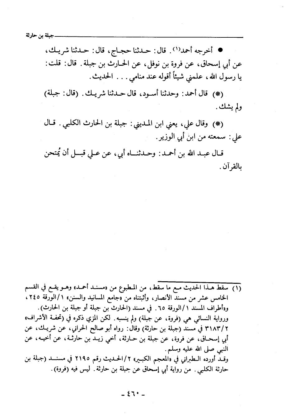 - أخرجه أحمد (٢٤٢٢٣) قال: حدَّثنا حَجَّاج، قال: حدَّثنا شَرِيك، عن أَبي إِسْحَاق، عَنْ فَرْوَةَ بْنِ نَوْفَلٍ، عَنِ الْحَارِثِ بْنِ جَبَلَةَ، قَالَ: