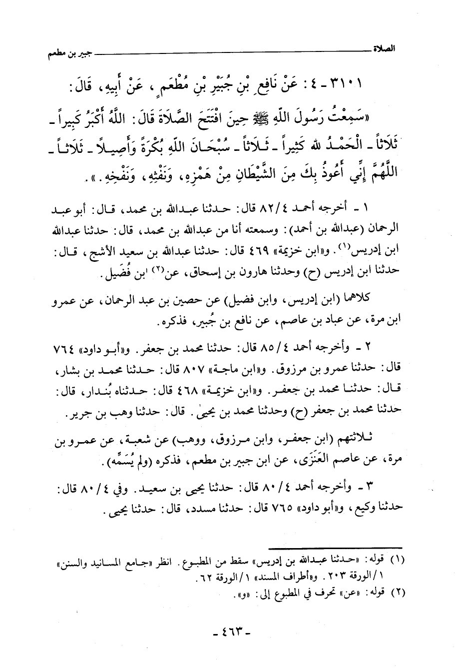 رَأَيْتُ رَسُولَ اللهِ صلى الله عليه وسلم، حِينَ دَخَلَ فِي صَلَاةٍ، فَقَالَ: اللَّهُ أَكْبَرُ كَبِيرًا، اللَّهُ أَكْبَرُ كَبِيرًا، اللَّهُ أَكْبَرُ كَبِيرًا، الْحَمْدُ ِللهِ بُكْرَةً وَأَصِيلاً، ثَلَاثًا، سُبْحَانَ اللهِ بُكْرَةً وَأَصِيلاً، ثَلَاثًا، اللَّهُمَّ إِنِّي أَعُوذُ بِكَ مِنَ الشَّيْطَانِ الرَّجِيمِ، مِنْ هَمْزِهِ، وَنَفْخِهِ، وَنَفْثِهِ.
