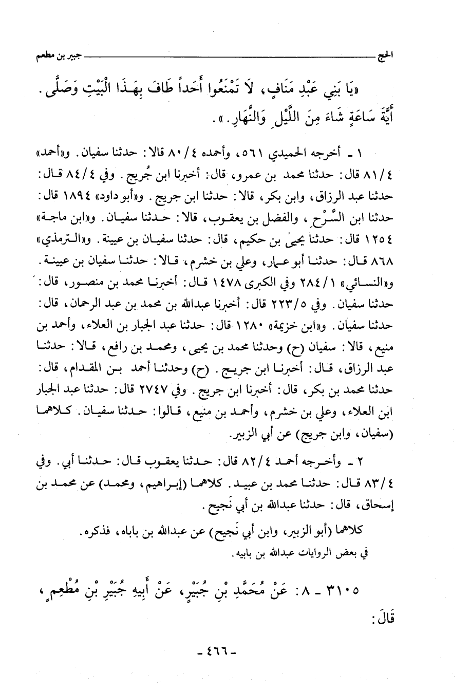 يَا بَنِي عَبْدِ مَنَافٍ، لَا تَمْنَعُوا أَحَدًا طَافَ بِهَذَا الْبَيْتِ وَصَلَّى، أَيَّةَ سَاعَةٍ شَاءَ، مِنَ اللَّيْلِ وَالنَّهَار.