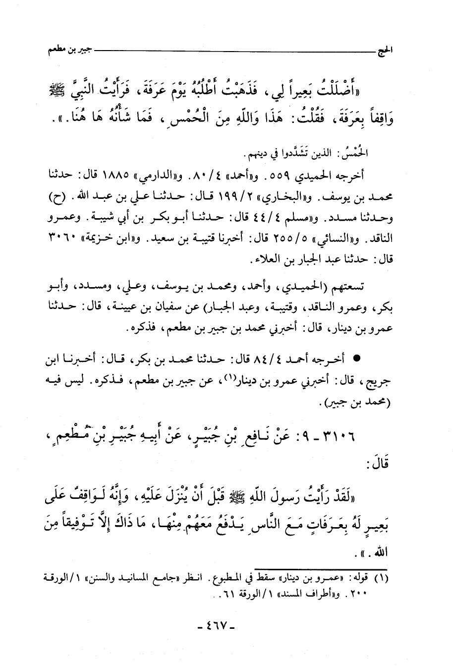 عشرتهم (الحُمَيْدِي، وأحمد، ومُحَمَّد بن يُوسُف، وعلي، ومُسَدَّد، وأبو بَكْر، وعَمْرو النَّاقِد، وقُتَيْبَة، وعَبْد الجَبَّار، والمَخْزُومِي، سَعِيد بن عَبْد الرَّحْمان) عن سُفْيان بن عُيَيْنَة، قال: حدَّثنا عَمْرو بن دِينَار، قال: أخبرني مُحَمَّد بن جُبَيْر بن مُطْعِم، فذكره.