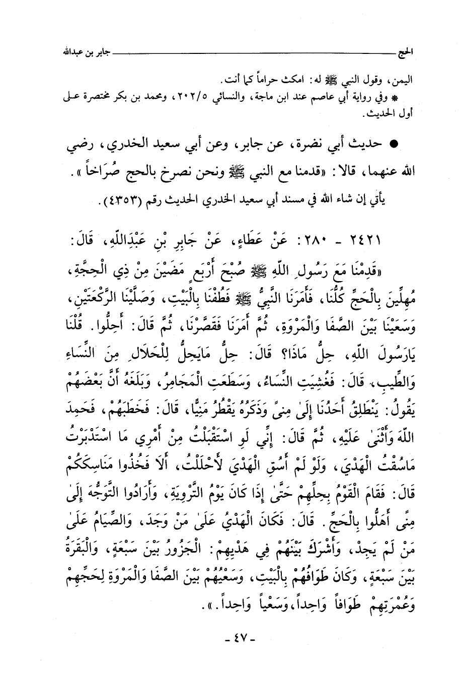 قَدِمْنَا مَعَ رَسُولِ اللهِ صلى الله عليه وسلم صُبْحَ أَرْبَعٍ مَضَيْنَ مِنْ ذِي الْحَِجَّةِ، مُهِلِّينَ بِالْحَجِّ كُلُّنَا، فَأَمَرَنَا النَّبِيُّ صلى الله عليه وسلم فَطُفْنَا بِالْبَيْتِ، وَصَلَّيْنَا الرَّكْعَتَيْنِ، وَسَعَيْنَا بَيْنَ الصَّفَا وَالْمَرْوَةِ، ثُمَّ أَمَرَنَا فَقَصَّرْنَا، ثُمَّ قَالَ: أَحِلُّوا. قُلْنَا: يَا رَسُولَ اللهِ، حِلُّ مَاذَا؟ قَالَ: حِلُّ مَا يَحِلُّ لِلْحَلَالِ مِنْ النِّسَاءِ وَالطِّيبِ، قَالَ: فَغُشِيَتِ النِّسَاءُ، وَسَطَعَتِ الْمَجَامِرُ، (قَالَ خَلَفٌ: وَبَلَغَهُ أَنَّ بَعْضَهُمْ يَقُولُ: يَنْطَلِقُ أَحَدُنَا إِلَى مِنًى وَذَكَرُهُ يَقْطُرُ مَنِيًّا) قَالَ: فَخَطَبَهُمْ، فَحَمِدَ اللهَ وَأَثْنَى عَلَيْهِ، ثُمَّ قَالَ: إِنِّي لَوْ اسْتَقْبَلْتُ مِنْ أَمْرِي مَا اسْتَدْبَرْتُ مَا سُقْتُ الْهَدْيَ، وَلَوْ لَمْ أَسُقِ الْهَدْيَ لأَحْلَلْتُ، أَلَا فَخُذُوا مَنَاسِكَكُمْ. قَالَ: فَأَقَامَ الْقَوْمُ بِحِلِّهِمْ، حَتَّى إِذَا كَانَ يَوْمُ التَّرْوِيَةِ، وَأَرَادُوا التَّوَجُّهَ إِلَى مِنًى، أَهَلُّوا بِالْحَجِّ. قَالَ: فَكَانَ الْهَدْيُ عَلَى مَنْ وَجَدَ، وَالصِّيَامُ عَلَى مَنْ لَمْ يَجِدْ، وَأَشْرَكَ بَيْنَهُمْ فِي هَدْيِهِمُ الْجَزُورَ بَيْنَ سَبْعَةٍ، وَالْبَقَرَةَ بَيْنَ سَبْعَةٍ، وَكَانَ طَوَافُهُمْ بِالْبَيْتِ، وَسَعْيُهُمْ بَيْنَ الصَّفَا وَالْمَرْوَةِ، لِحَجِّهِمْ وَعُمْرَتِهِمْ، طَوَافًا وَاحِدًا، وَسَعْيًا وَاحِدًا.