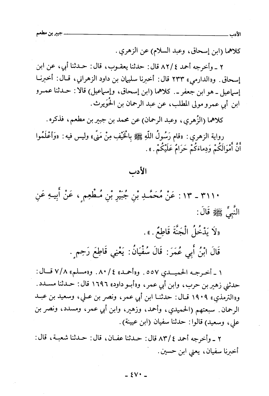 ٣١١٠ - عَنْ مُحَمَّدِ بْنِ جُبَيْرِ بْنِ مُطْعِمٍ، عَنْ أَبِيهِ، عَنِ النَّبِيِّ صلى الله عليه وسلم، قَالَ: