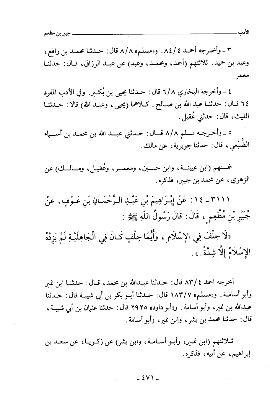 ٣١١١ - عَنْ إِبْرَاهِيمَ بْنِ عَبْدِ الرَّحْمَانِ بْنِ عَوْفٍ، عَنْ جُبَيْرِ بْنِ مُطْعِمٍ، قَالَ: قَالَ رَسُولُ اللهِ صلى الله عليه وسلم:
