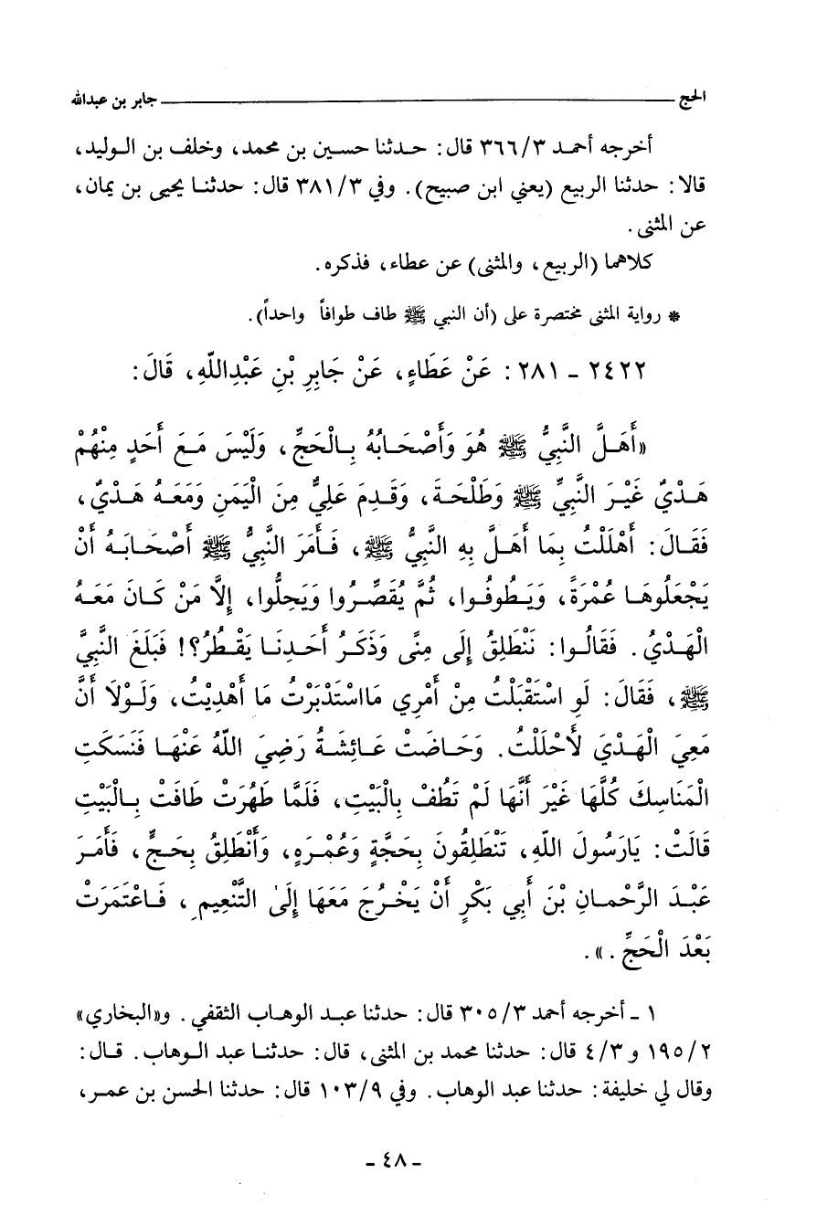 - وفي رواية: كُنَّا مَعَ رَسُولِ اللهِ صلى الله عليه وسلم، فَلَبَّيْنَا بِالْحَجِّ، وَقَدِمْنَا مَكَّةَ لأَرْبَعٍ خَلَوْنَ مِنْ ذِي الْحِجَّةِ، فَأَمَرَنَا النَّبِيُّ صلى الله عليه وسلم أَنْ نَطُوفَ بِالْبَيْتِ، وَبِالصَّفَا وَالْمَرْوَةِ، وَأَنْ نَجْعَلَهَا عُمْرَةً، وَلْنَحِلَّ، إِلَاّ مَنْ كَانَ مَعَهُ هَدْيٌ، قَالَ: وَلَمْ يَكُنْ مَعَ أَحَدٍ مِنَّا هَدْيٌ غَيْرَ النَّبِيِّ صلى الله عليه وسلم، وَطَلْحَةَ، وَجَاءَ عَلِيٌّ مِنَ الْيَمَنِ مَعَهُ الْهَدْيُ، فَقَالَ: أَهْلَلْتُ بِمَا أَهَلَّ بِهِ رَسُولُ اللهِ صلى الله عليه وسلم، فَقَالُوا: نَنْطَلِقُ إِلَى مِنًى، وَذَكَرُ أَحَدِنَا يَقْطُرُ؟! قَالَ رَسُولُ اللهِ صلى الله عليه وسلم: إِنِّي لَوِ اسْتَقْبَلْتُ مِنْ أَمْرِي مَا اسْتَدْبَرْتُ، مَا أَهْدَيْتُ، وَلَوْلَا أَنَّ مَعِي الْهَدْيَ لَحَلَلْتُ، قَالَ: وَلَقِيَهُ سُرَاقَةُ وَهُْوَ يَرْمِي جَمْرَةَ الْعَقَبَةِ، فَقَالَ: يَا رَسُولَ اللهِ، أَلَنَا هَذِهِ خَاصَّةً؟ قَالَ: لَا، بَلْ لأَبَدٍ، قَالَ: وَكَانَتْ عَائِشَةُ قَدِمَتْ مَكَّةَ وَهِْيَ حَائِضٌ، فَأَمَرَهَا النَّبِيُّ صلى الله عليه وسلم أَنْ تَنْسُكَ الْمَنَاسِكَ كُلَّهَا، غَيْرَ أَنَّهَا لَا تَطُوفُ، وَلَا تُصَلِّي حَتَّى تَطْهُرَ، فَلَمَّا نَزَلُوا الْبَطْحَاءَ، قَالَتْ عَائِشَةُ: يَا رَسُولَ اللهِ، أَتَنْطَلِقُونَ بِحَجَّةٍ وَعُمْرَةٍ، وَأَنْطَلِقُ بِحَِجَّةٍ؟! قَالَ: ثُمَّ أَمَرَ عَبْدَ الرَّحْمَانِ بْنَ أَبِي بَكْرٍ الصِّدِّيقِ أَنْ يَنْطَلِقَ مَعَهَا إِلَى التَّنْعِيمِ، فَاعْتَمَرَتْ عُمْرَةً فِي ذِي الْحَِجَّةِ بَعْدَ أَيَّامِ الْحَجِّ.