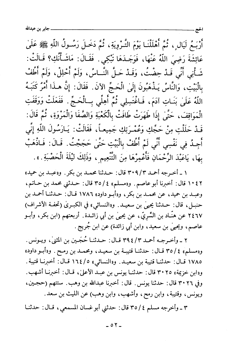 أَرْبَعُ لَيَالٍ، ثُمَّ أَهْلَلْنَا يَوْمَ التَّرْوِيَةِ، ثُمَّ دَخَلَ رَسُولُ اللهِ صلى الله عليه وسلم عَلَى عَائِشَةَ فَوَجَدَهَا تَبْكِى، فَقَالَ: مَا شَأْنُكِ؟ قَالَتْ: شَأْنِي أَنِّي حِضْتُ، وَقَدْ حَلَّ النَّاسُ وَلَمْ أَحْلِلْ، وَلَمْ أَطُفْ بِالْبَيْتِ، وَالنَّاسُ يَذْهَبُونَ إِلَى الْحَجِّ الآنَ، قَالَ: فَإِنَّ هَذَا أَمْرٌ كَتَبَهُ اللهُ، عَزَّ وَجَلَّ، عَلَى بَنَاتِ آدَمَ، فَاغْتَسِلِي ثُمَّ أَهِلِّي بِالْحَجِّ، فَفَعَلَتْ وَوَقَفَتِ الْمَوَاقِفَ كُلَّهَا، حَتَّى إِذَا طَهُرَتْ طَافَتْ بِالْكَعْبَةِ، وَبِالصَّفَا وَالْمَرْوَةِ، ثُمَّ قَالَ: قَدْ حَلَلْتِ مِنْ حَجِّكِ وَعُمْرَتِكِ جَمِيعًا، فَقَالَتْ: يَا رَسُولَ اللهِ، إِنِّي أَجِدُ فِي نَفْسِي أَنِّي لَمْ أَطُفْ بِالْبَيْتِ حَتَّى حَجَجْتُ، قَالَ: فَاذْهَبْ بِهَا يَا عَبْدَ الرَّحْمَانِ بْنَ أَبِي بَكْرٍ فَأَعْمِرْهَا مِنَ التَّنْعِيمِ، وَذَلِكَ لَيْلَةَ الْحَصْبَةِ.