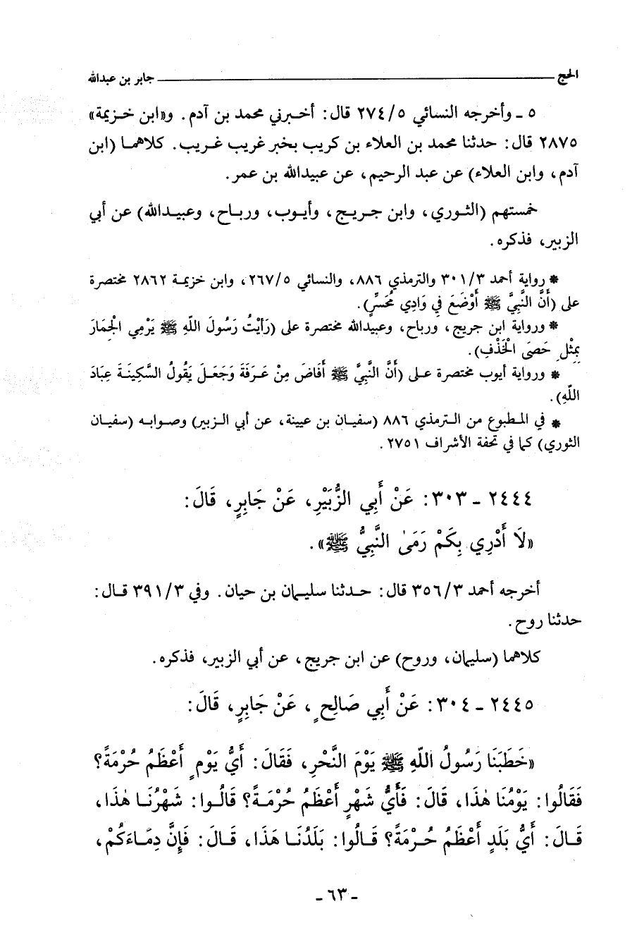 بَشَّار، حدَّثنا يَحيى بن سَعِيد القَطَّان، حدَّثنا ابن جُرَيْج. و"النَّسائي" ٥/ ٢٥٨، وفي "الكبرى" ٤٠٤٤ قال: أخبرنا عَمْرو بن مَنْصُور , قال: حدَّثنا أبو نُعَيْم , قال: حدَّثنا سُفْيان. وفي ٥/ ٢٦٧، وفي "الكبرى" ٤٠٤٥ قال: أخبرنا إبراهيم بن مُحَمد , قال: حدَّثنا يَحيى، عن سُفْيان. وفي ٥/ ٢٧٠، وفي "الكبرى" ٤٠٥٤ قال: أخبرنا عَمْرو بن علي , قال: حدَّثنا يَحيى بن سَعِيد , قال: أنبأنا ابن جُرَيْج. وفي ٥/ ٢٧٤، وفي "الكبرى" ٤٠٦٦ قال: أخبرني مُحَمد بن آدم، عن عَبْد الرَّحِيم، عن عُبَيْد اللهِ بن عُمَر، وذكر آخر. وفي ٥/ ٢٧٤، وفي "الكبرى" ٤٠٦٧ قال: أخبرنا مُحَمد بن بَشَّار , قال: حدَّثنا يَحيى، عن ابن جُرَيْج. وفي "الكبرى" ٤٠٠٢ قال: أخبرنا مُحَمد بن المُثَنَّى، عن عَبْد الرَّحْمان، قال: حدَّثنا سُفْيان، هو الثَّوْرِي. و"ابن خزيمة" ٢٨٦٢ قال: حدَّثنا سَلْم بن جُنَادَة، حدَّثنا وَكِيع، عن سُفْيان (ح) وحدَّثنا مُحَمد بن سُفْيان بن أَبي الزَّرْد الأُبُلِّي، حدَّثنا أبو عامر، حدَّثنا سُفْيان (ح) وحدَّثنا مُحَمد بن العَلَاء، حدَّثنا قَبِيصَة، عن سُفْيان. وفي (٢٨٧٥) قال: حدَّثنا مُحَمد بن العَلَاء بن كُرَيْب، بخبرٍ غريبٍ غريبٍ، حدَّثنا عَبْد الرَّحِيم بن سُلَيْمان، عن عُبَيْد اللهِ. وفي (٢٨٧٧) قال: حدَّثنا علي بن خَشْرَم، أخبرنا عِيسَى، عن ابن جُرَيْج (ح) وحدَّثنا مُحَمد بن مَعْمَر، حدَّثنا مُحَمد، أخبرنا ابن جُرَيْج.