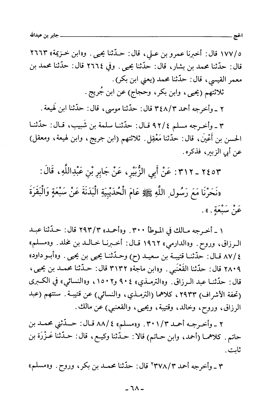 - وفي رواية: حَجَجْنَا مَعَ رَسُولِ اللهِ صلى الله عليه وسلم، فَنَحَرْنَا الْبَعِيرَ عَنْ سَبْعَةٍ، وَالْبَقَرَةَ عَنْ سَبْعَةٍ.