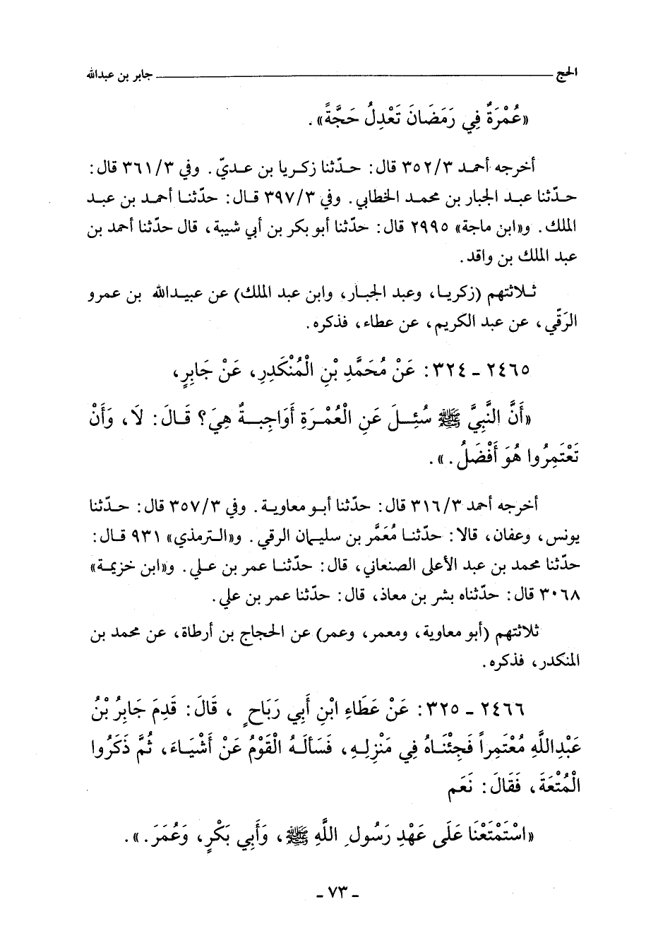 - وفي رواية: جَاءَ رَجُلٌ إِلَى النَّبِيِّ صلى الله عليه وسلم فَقَالَ: يَا رَسُولَ اللهِ، الْعُمْرَةُ أَوَاجِبَةٌ هِيَ؟ قَالَ: لَا.