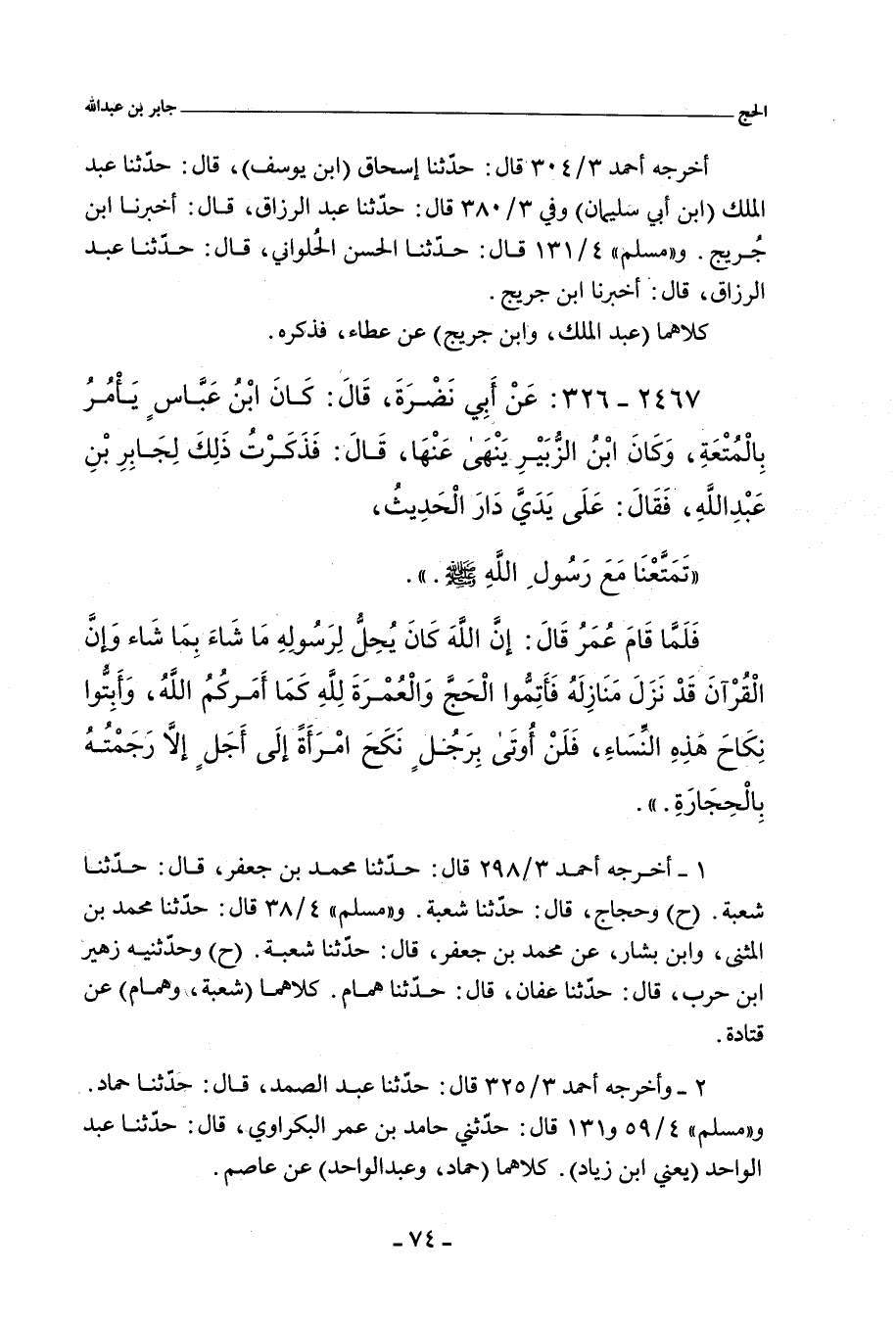 ٢٤٦٧ - عَنْ أَبِي نَضْرَةَ، قَالَ: كَانَ ابْنُ عَبَّاسٍ يَأْمُرُ بِالْمُتْعَةِ، وَكَانَ ابْنُ الزُّبَيْرِ يَنْهَى عَنْهَا، قَالَ: فَذَكَرْتُ ذَلِكَ لِجَابِرِ بْنِ عَبْدِ اللهِ، فَقَالَ: عَلَى يَدَيَّ دَارَ الْحَدِيثُ؛