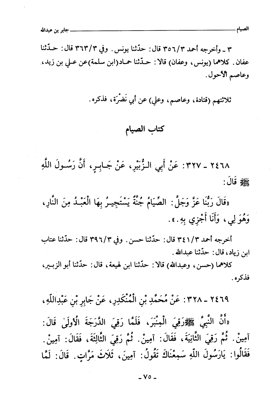 - لفظ عَبْد اللهِ: عَنِ النَّبِيِّ صلى الله عليه وسلم، قَالَ: إِنَّمَا الصِّيَامُ جُنَّةٌ، يَسْتَجِنُّ بِهَا الْعَبْدُ مِنَ النَّارِ، هُوَ لِي، وَأَنَا أَجْزِي بِهِ.