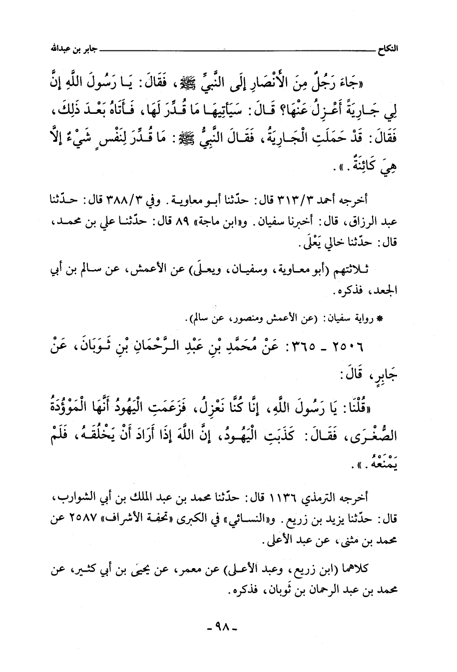 - أخرجه أحمد ٣/ ٣٨٨ (١٥٢٤١) قال: حدَّثنا عَبْد الرَّزَّاق، أخبرنا سُفْيان، عن الأَعْمَش، ومَنْصُور، عن سالم بن أَبي الجَعْد، عَنْ جَابِرِ بْنِ عَبْدِ اللهِ، قَالَ: