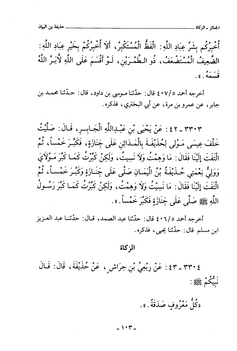 ٣٣٠٣ - عَنْ يَحيى بْنِ عَبْد اللهِ الْجَابِرِ، قَالَ: صَلَّيْتُ خَلْفَ عِيسَى، مَوْلًى لِحُذَيْفَةَ، بِالْمَدَائِنِ عَلَى جَِنَازَةٍ، فَكَبَّرَ خَمْسًا، ثُمَّ الْتَفَتَ إِلَيْنَا، فَقَالَ: مَا وَهِمْتُ وَلَا نَسِيتُ، وَلَكِنْ كَبَّرْتُ كَمَا كَبَّرَ مَوْلَايَ , وَوَلِيُّ نِعْمَتِي حُذَيْفَةُ بْنُ الْيَمَانِ، صَلَّى عَلَى جَِنَازَةٍ وكَبَّرَ خَمْسًا، ثُمَّ الْتَفَتَ إِلَيْنَا، فَقَالَ: مَا نَسِيْتُ وَلَا وَهِمْتُ،