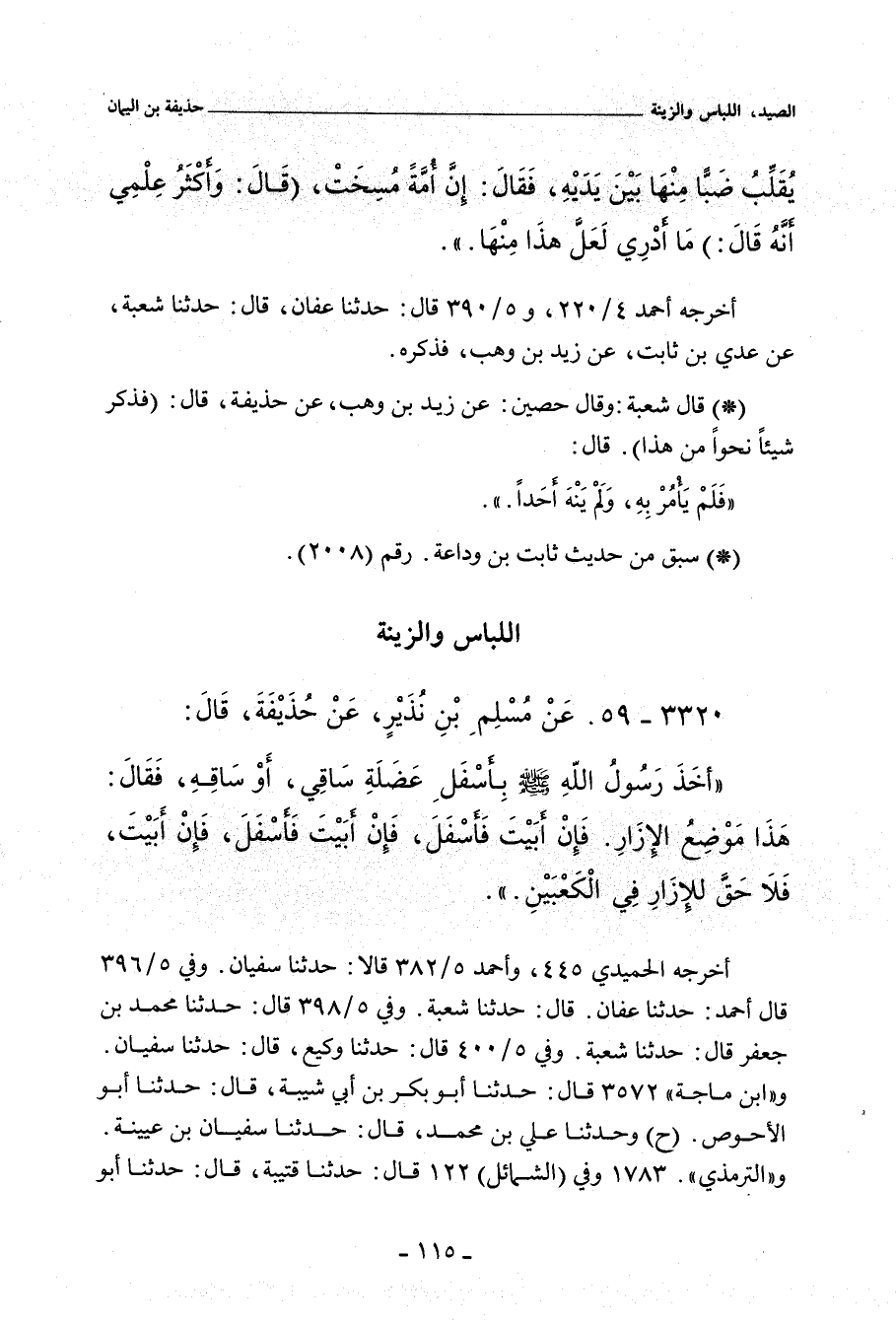 أَخَذَ رَسُولُ اللهِ صلى الله عليه وسلم بِأَسْفَلِ عَضَلَةِ سَاقِي، أَوْ سَاقِهِ، فَقَالَ: هَذَا مَوْضِعُ الإِزَارِ، فَإِنْ أَبَيْتَ فَأْسْفَلَ، فَإِنْ أَبَيْتَ فَأْسْفَلَ، فَإِنْ أَبَيْتَ، فَلَا حَقَّ لِلإِزَارِ فِي الْكَعْبَيْنِ.